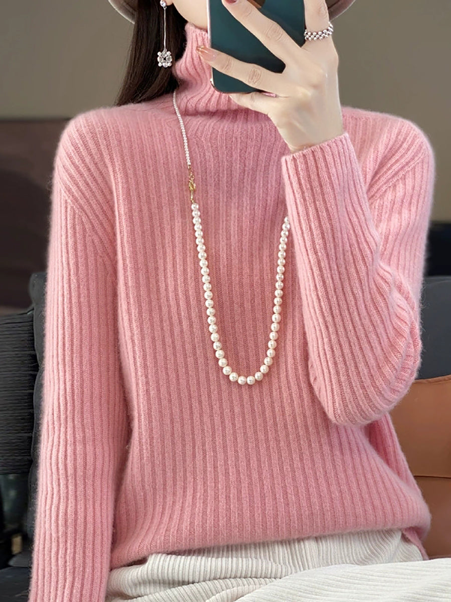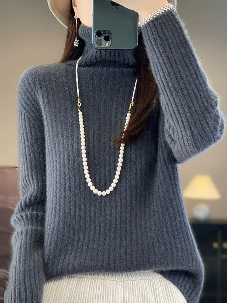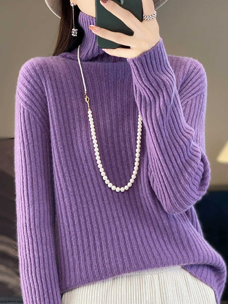 Suéter feminino de gola alta em lã de cor lisa para o inverno