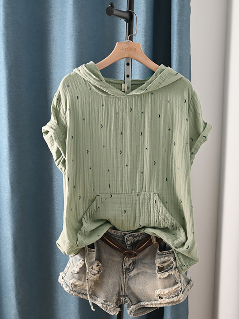 Camisa feminina de verão com estampa vintage e gola redonda fina de rami