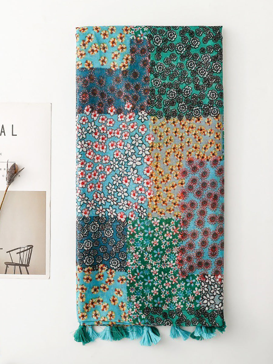 Cachecol feminino estilo boêmio com estampa floral e borlas