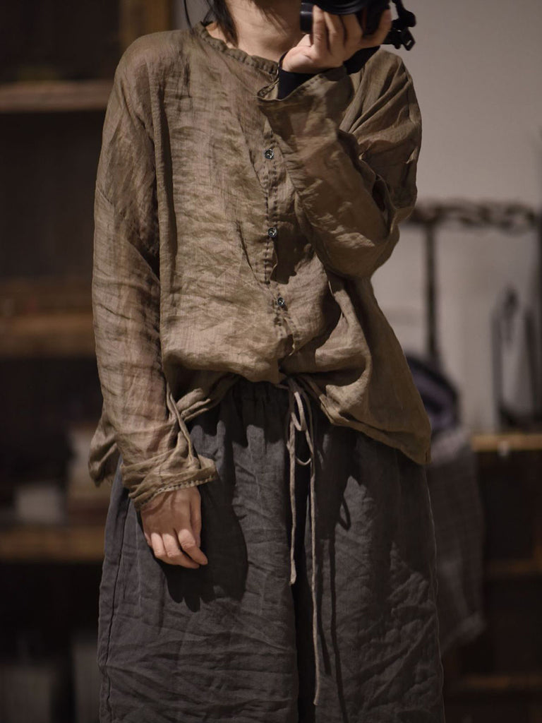 Mulheres Vintage Outono Sólido Linho Camisa Casaco