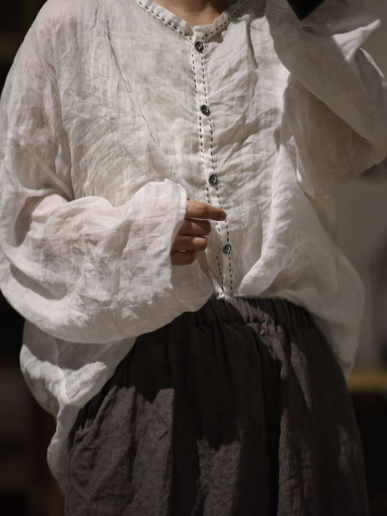 Camisa feminina Artsy Lattice 100% linho com gola virada para baixo