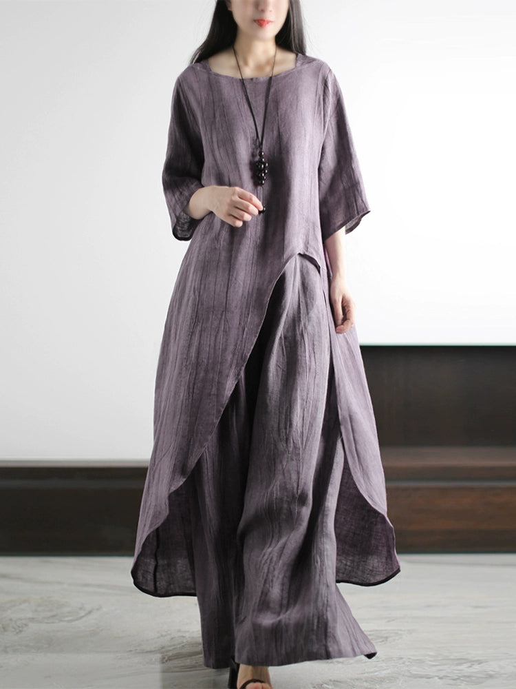 Ternos soltos femininos de verão vintage cor pura gola redonda