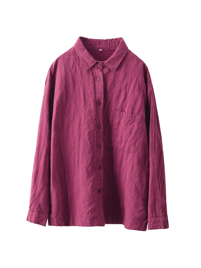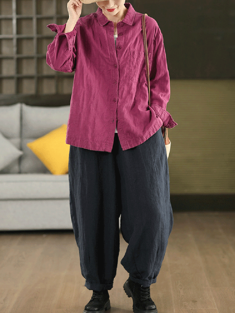 Camisa feminina de outono, cor pura, 100% linho, gola virada para baixo