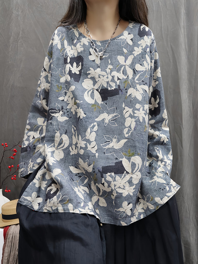 Camisa feminina de outono vintage com flores 100% linho e gola redonda