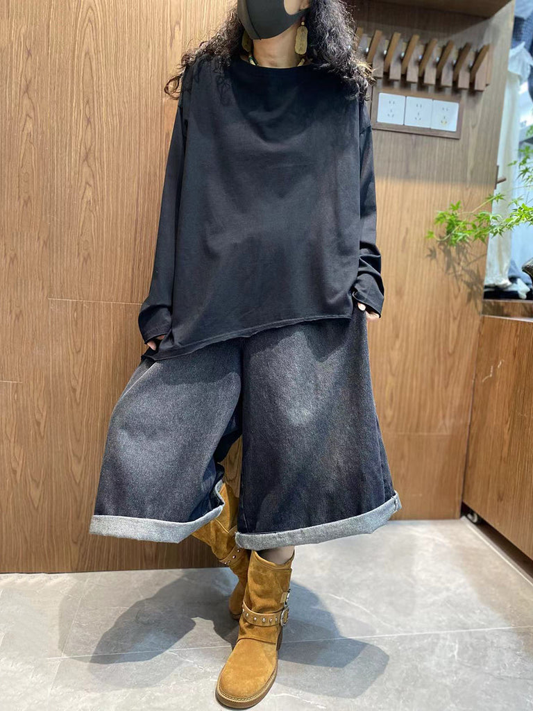 Camisa feminina casual de outono, cor pura, 100% algodão, gola redonda