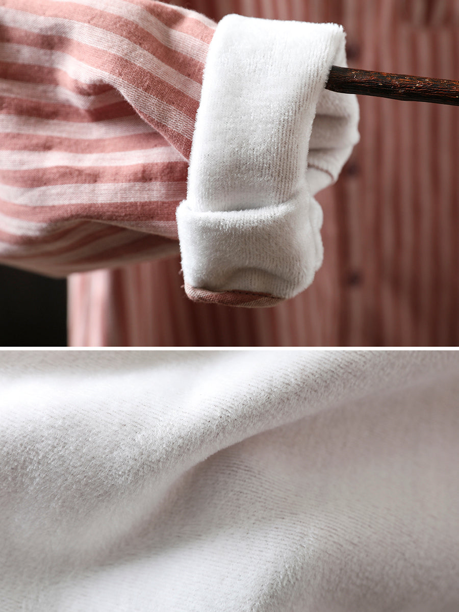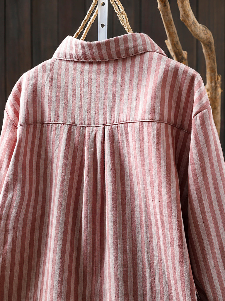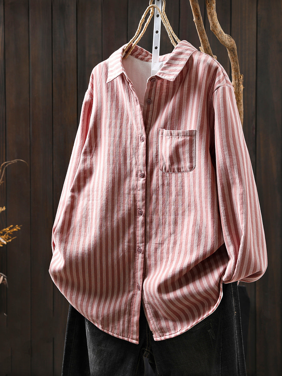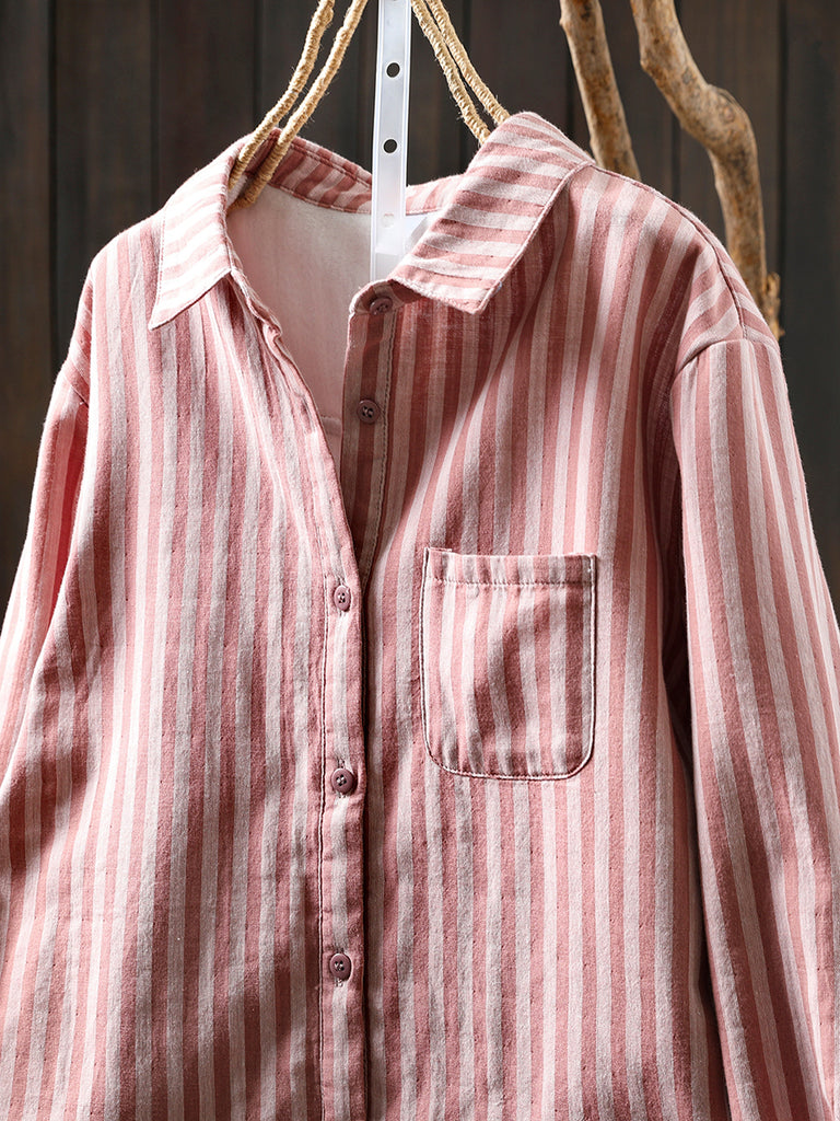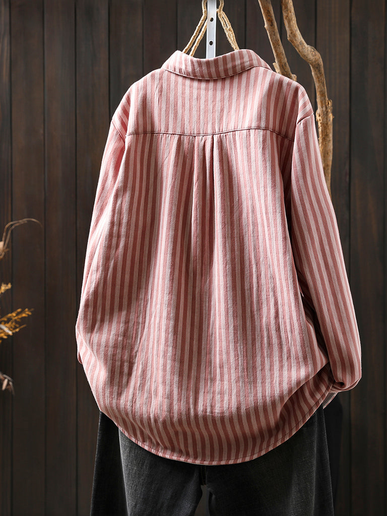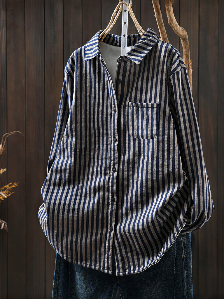 Blusa feminina de inverno listrada com gola dobrável, 100% algodão.