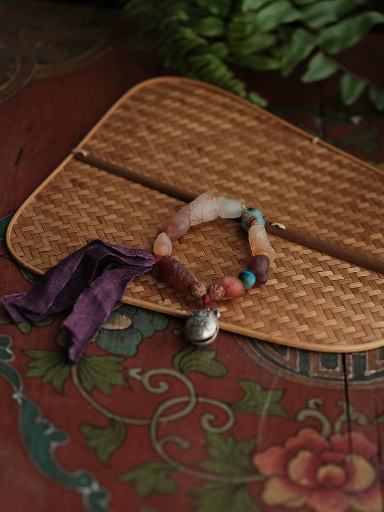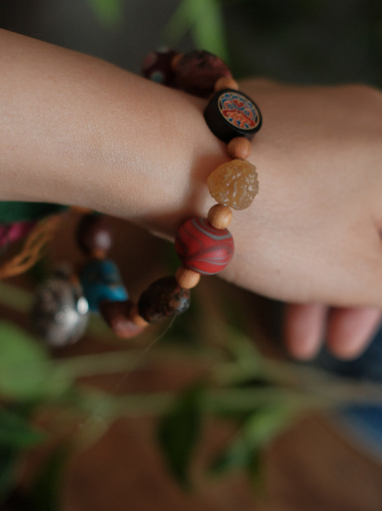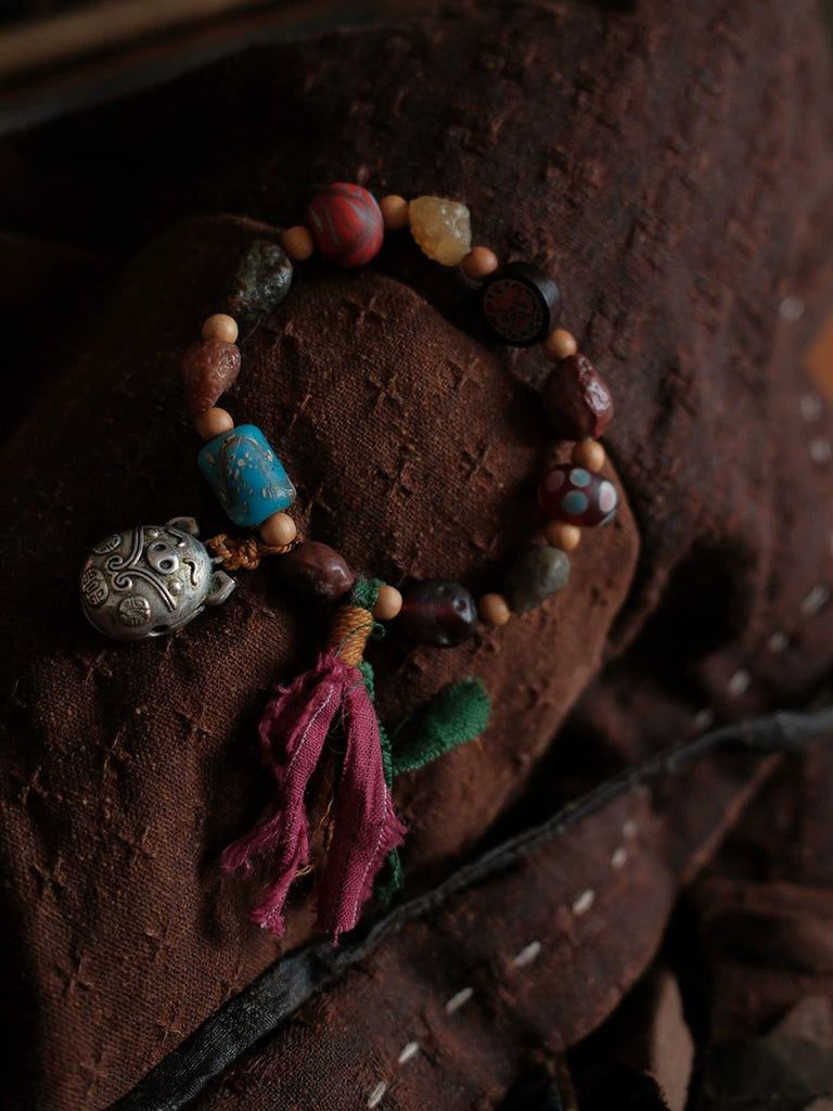 Pulseira feminina étnica de madeira com contas e borla, feita à mão.