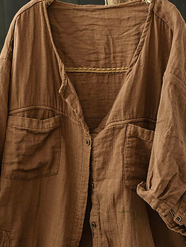 Camisa de algodão plus size feminina, de verão, cor pura, com decote em V