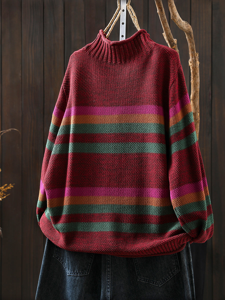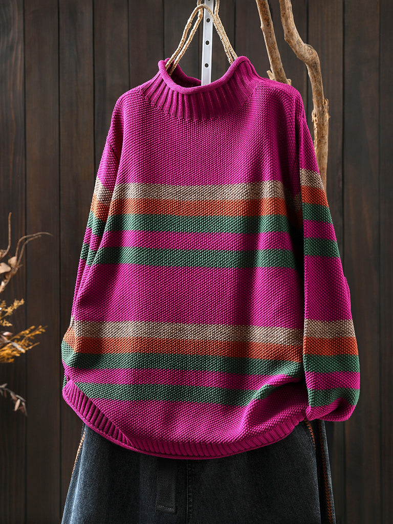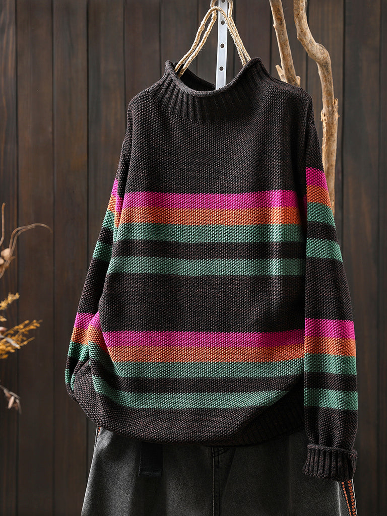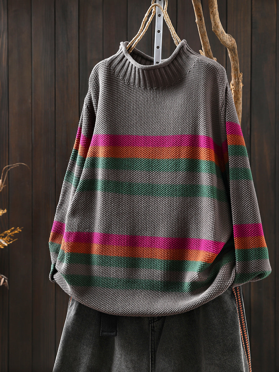 Suéter feminino de gola alta com listras artísticas para o outono