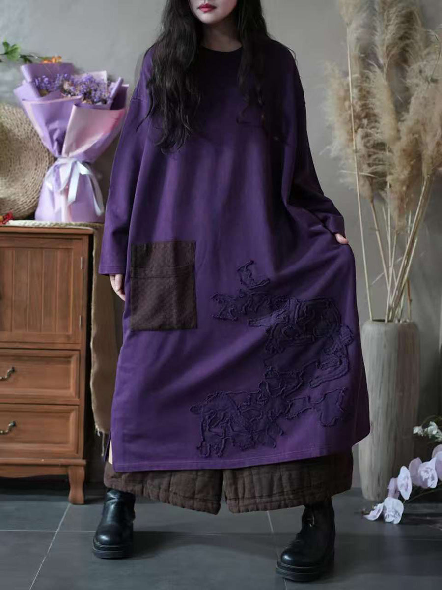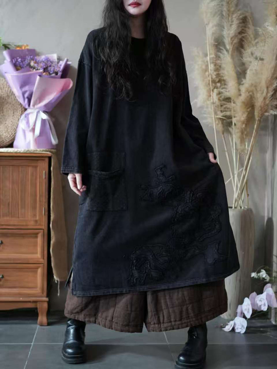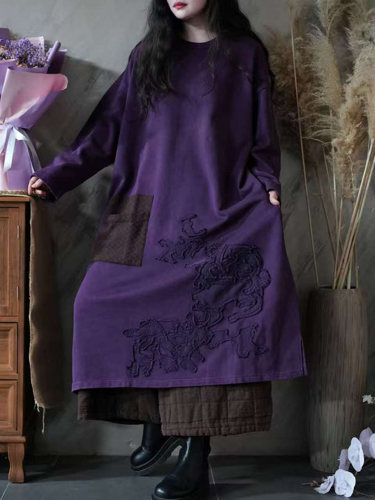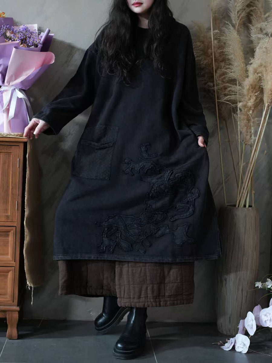 Vestido feminino vintage de outono com decote redondo e aplicações.