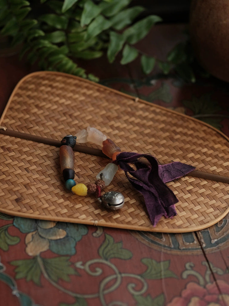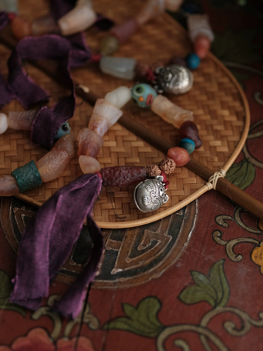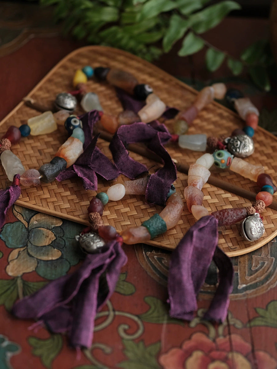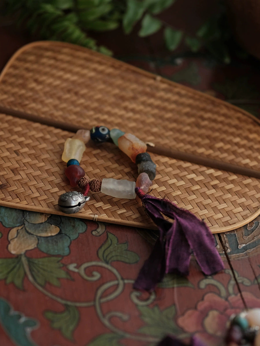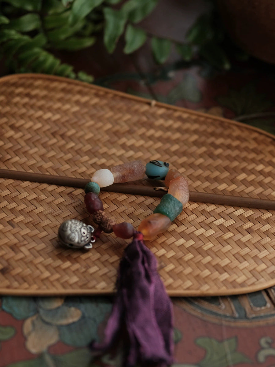 Pulseira feminina étnica de madeira com contas e borla, feita à mão.
