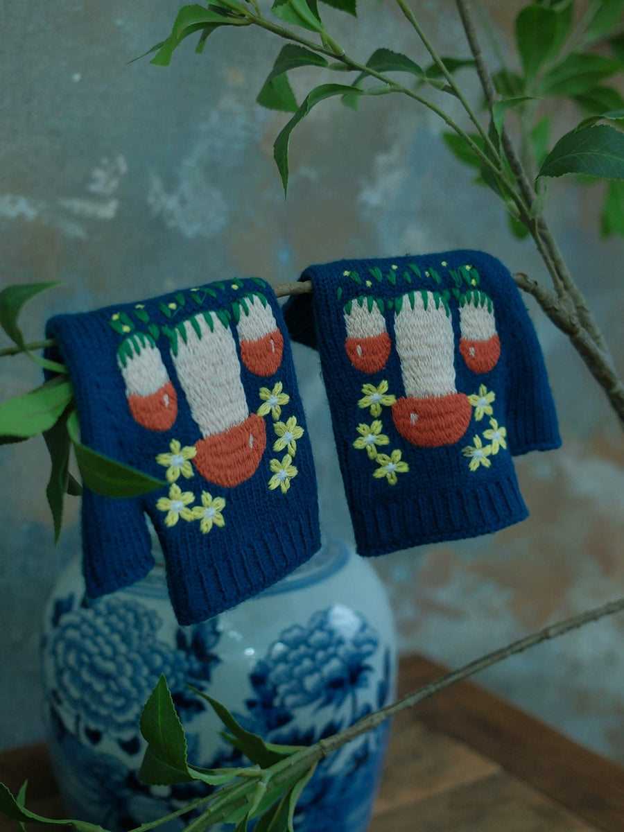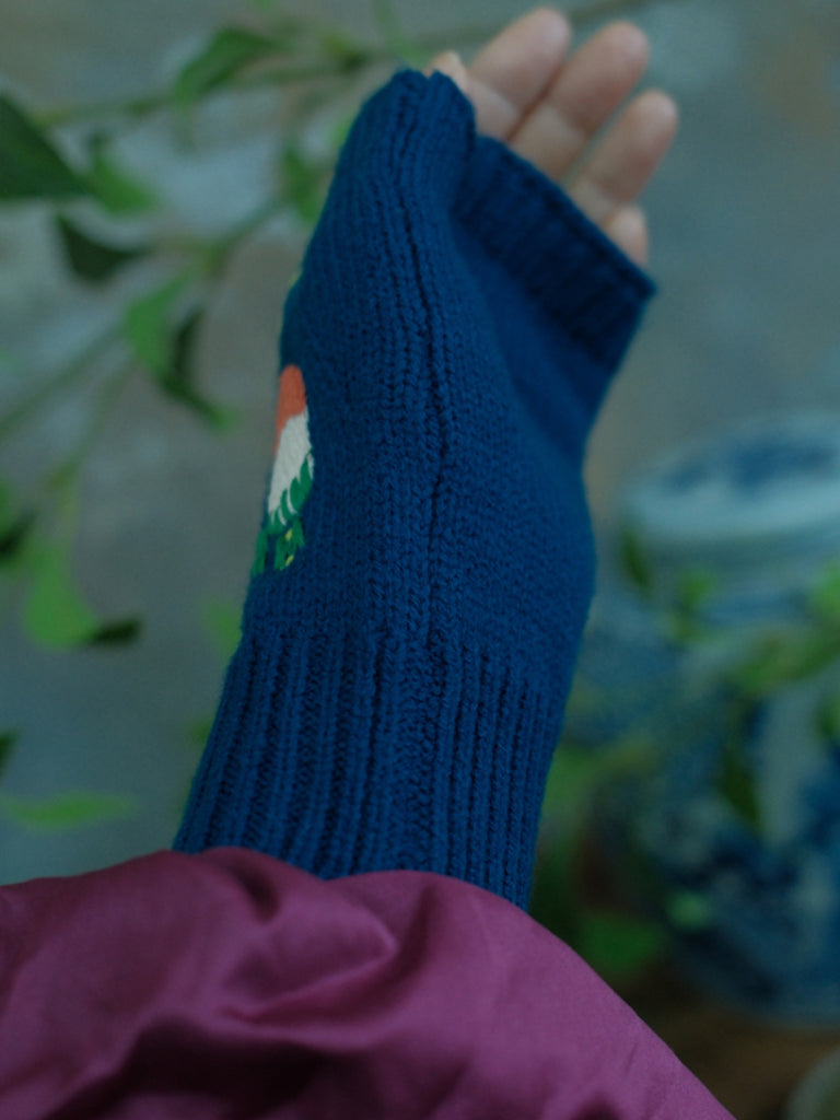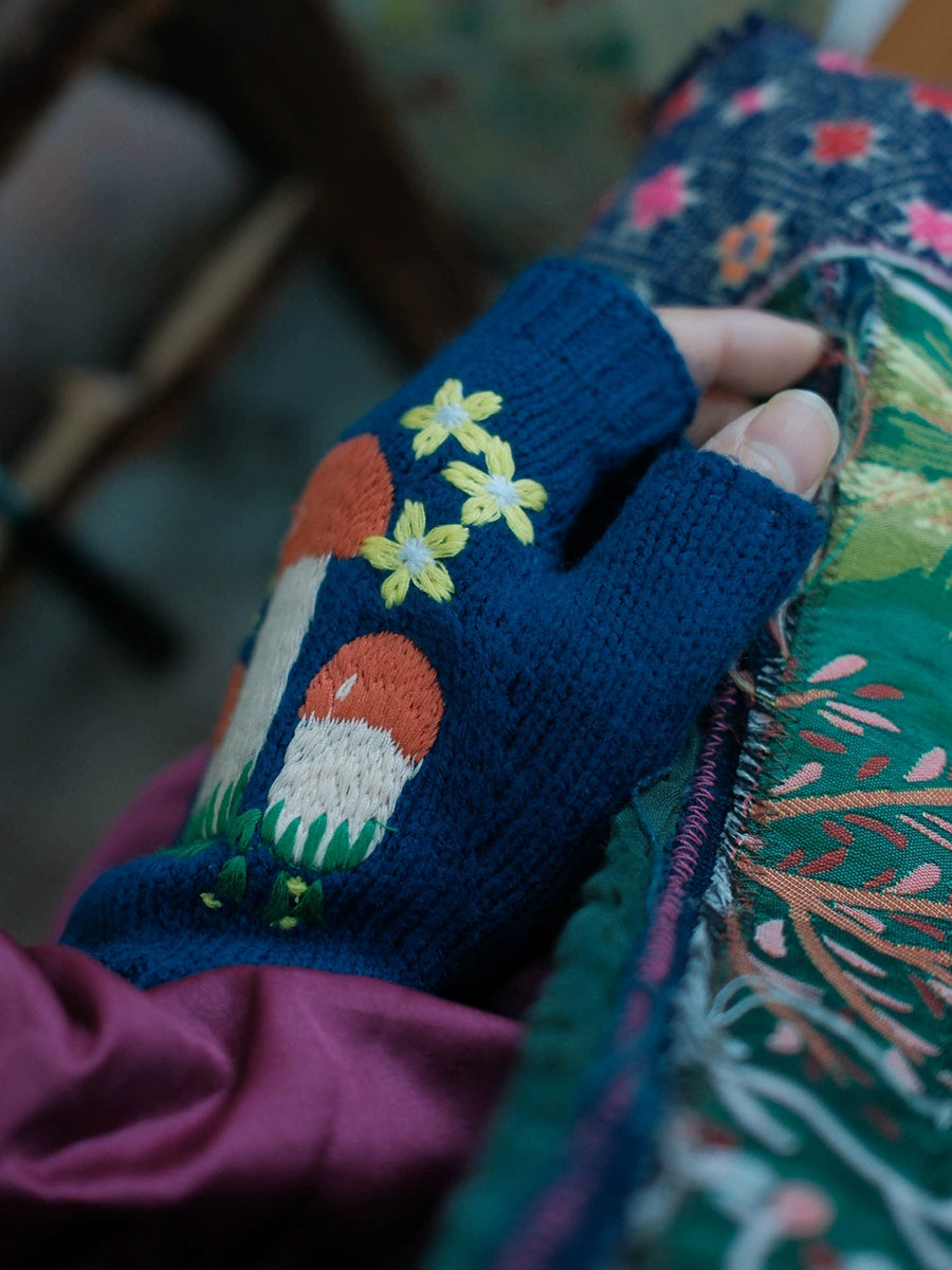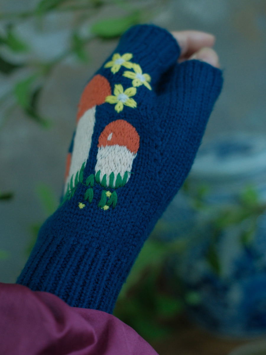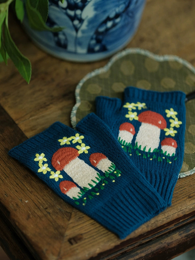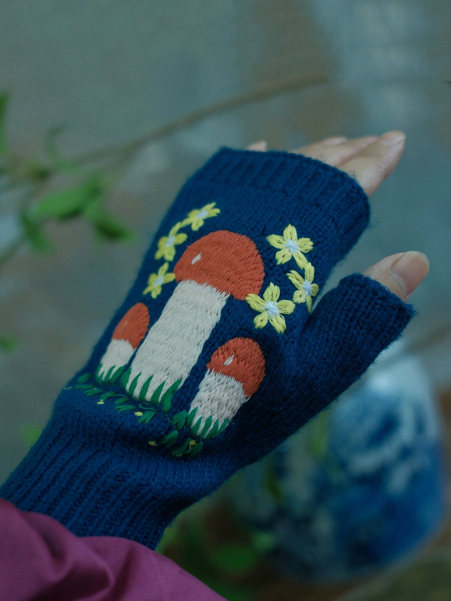 Luvas femininas vintage de tricô com estampa de cogumelos
