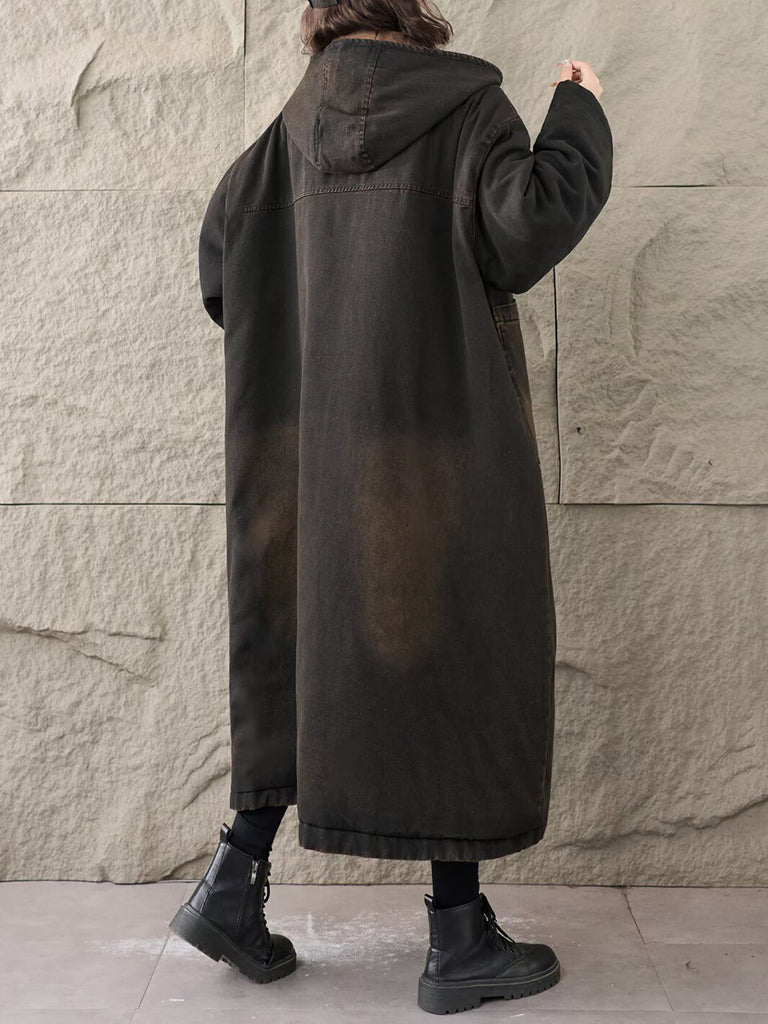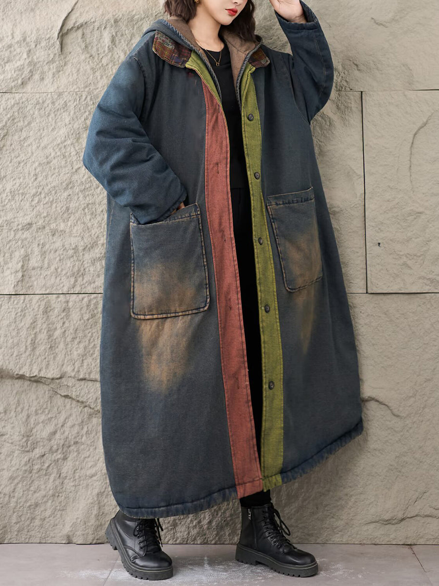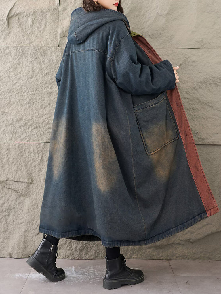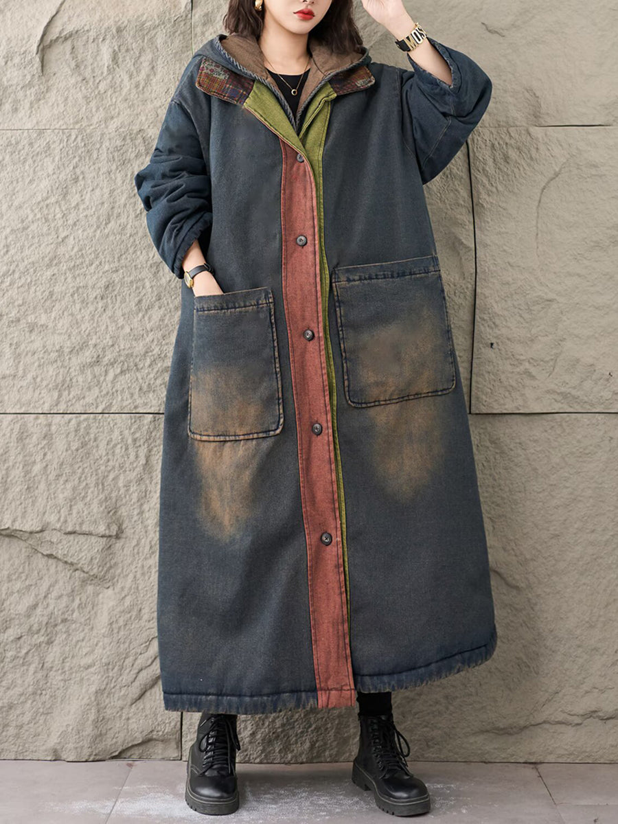 Feito em jeans, este casaco apresenta um design de cor sólida com gola alta e mangas raglan longas. Seu estilo retrô o torna uma escolha ideal para o outono e inverno.