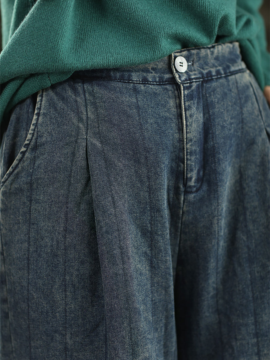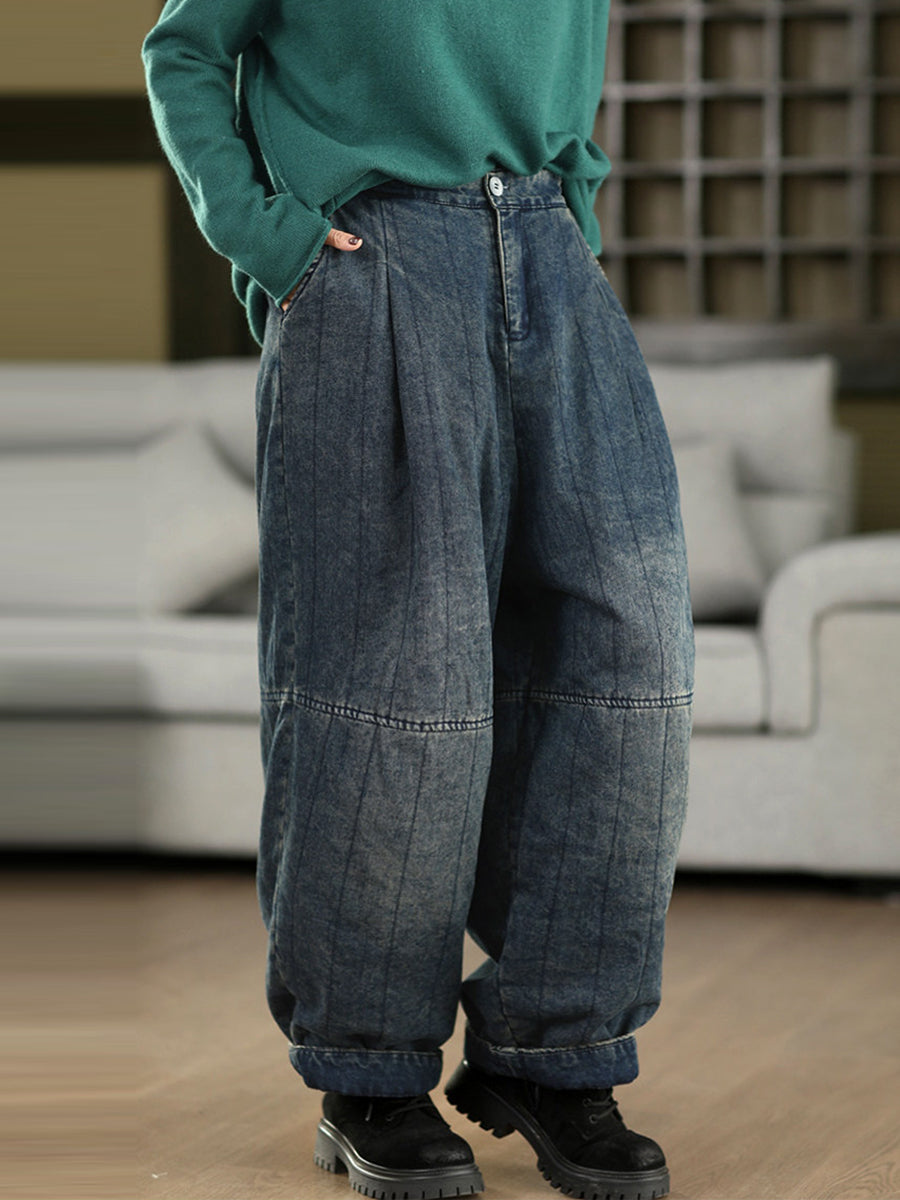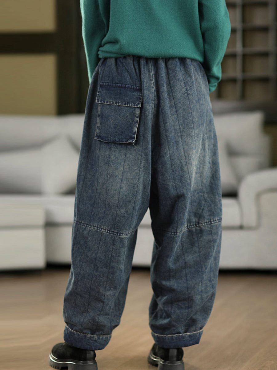 Calça feminina de inverno retrô em jeans lavado com bojo