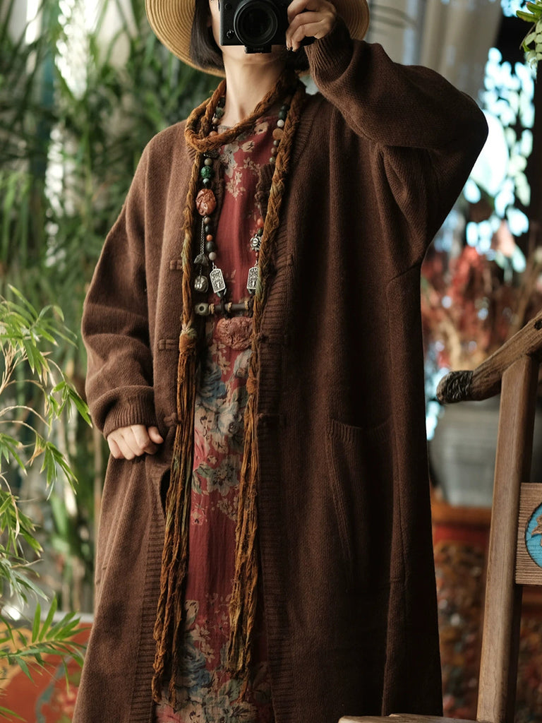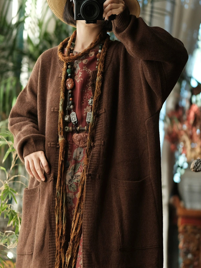 Casaco de lã tricotado com decote redondo e cor pura vintage para mulheres
