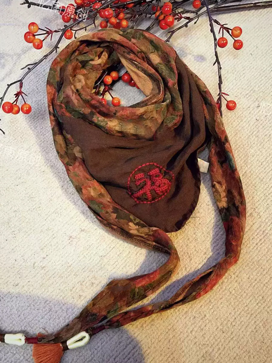 Women Vintage Flower Spliced Embroidery Linen Triangular Scarf