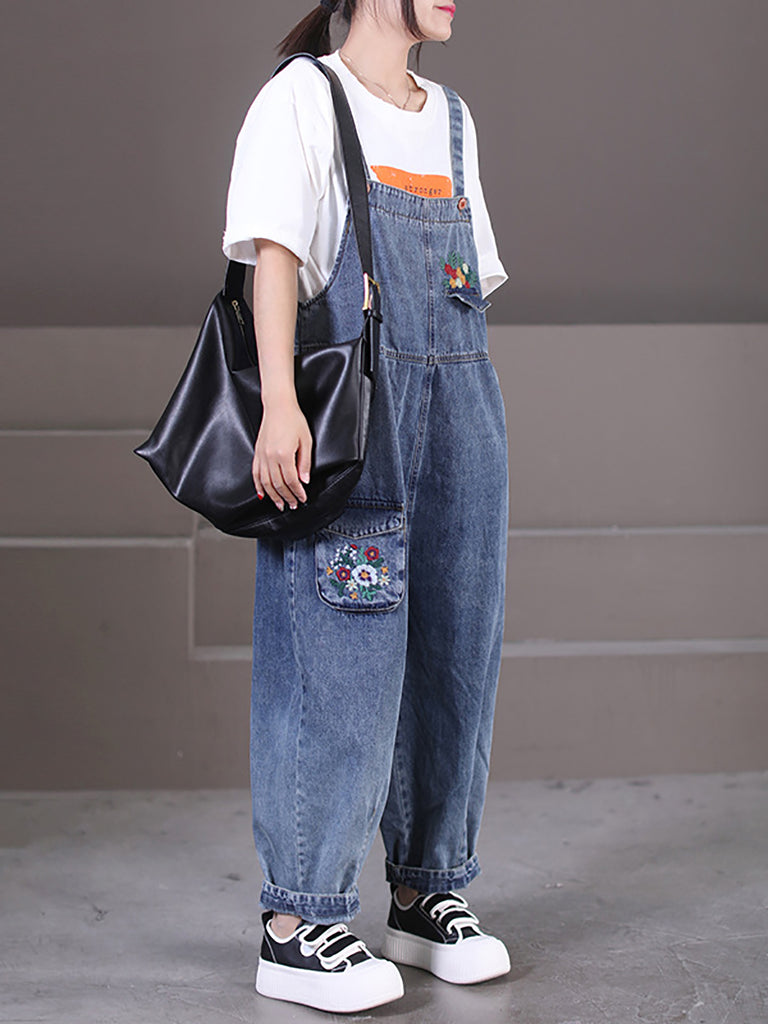 Calças harém jeans bordadas com flores retrô de primavera para mulheres