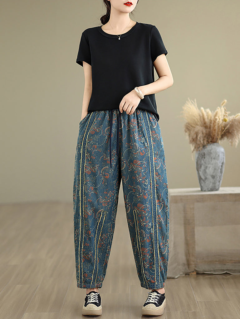 Calças harém femininas retrô de outono em denim de cor pura emendadas