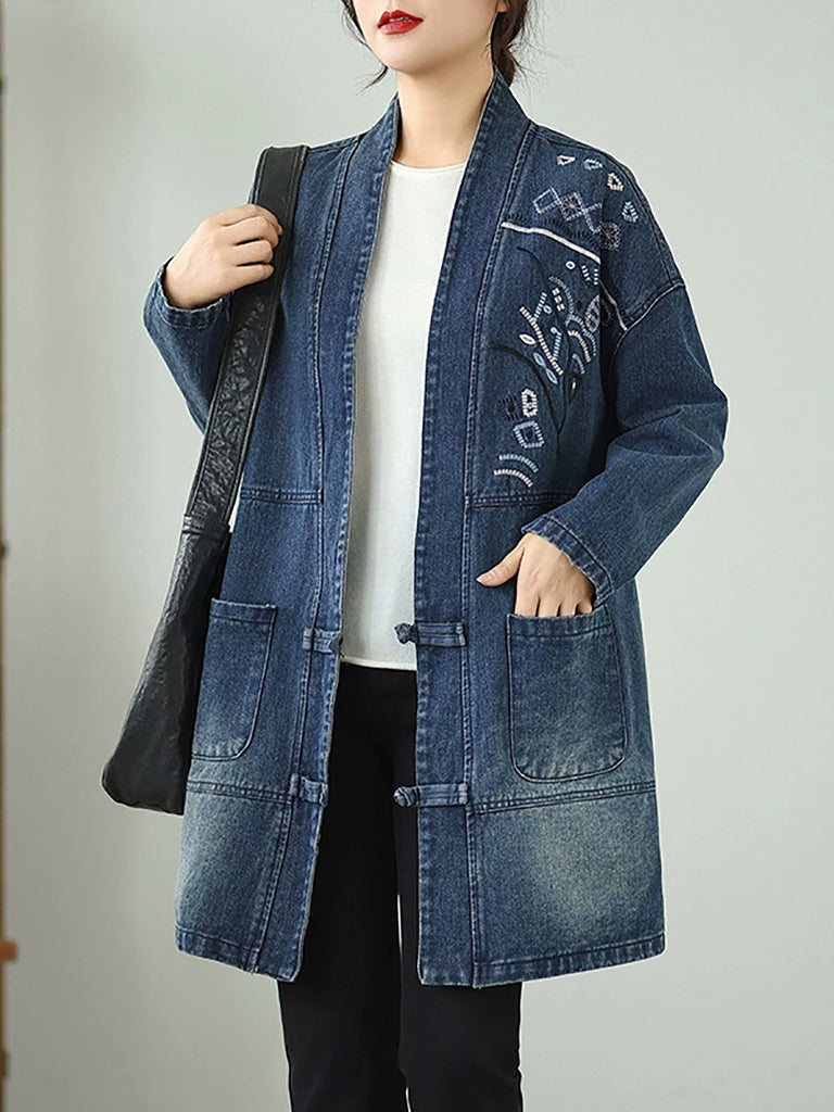 Casaco feminino vintage de outono com bordado jeans e decote em V