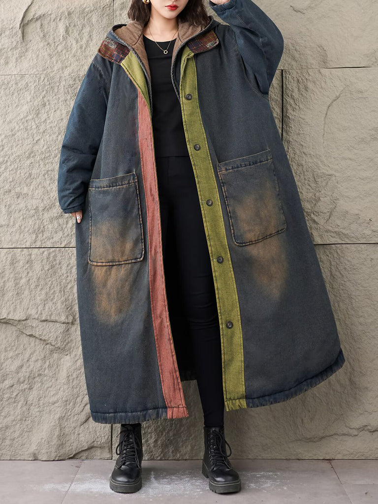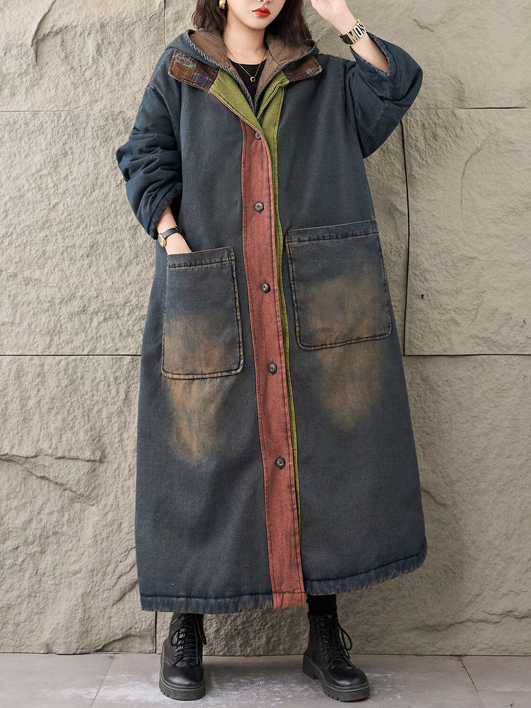 Casaco feminino Artsy Flower emendado longo jeans com capuz