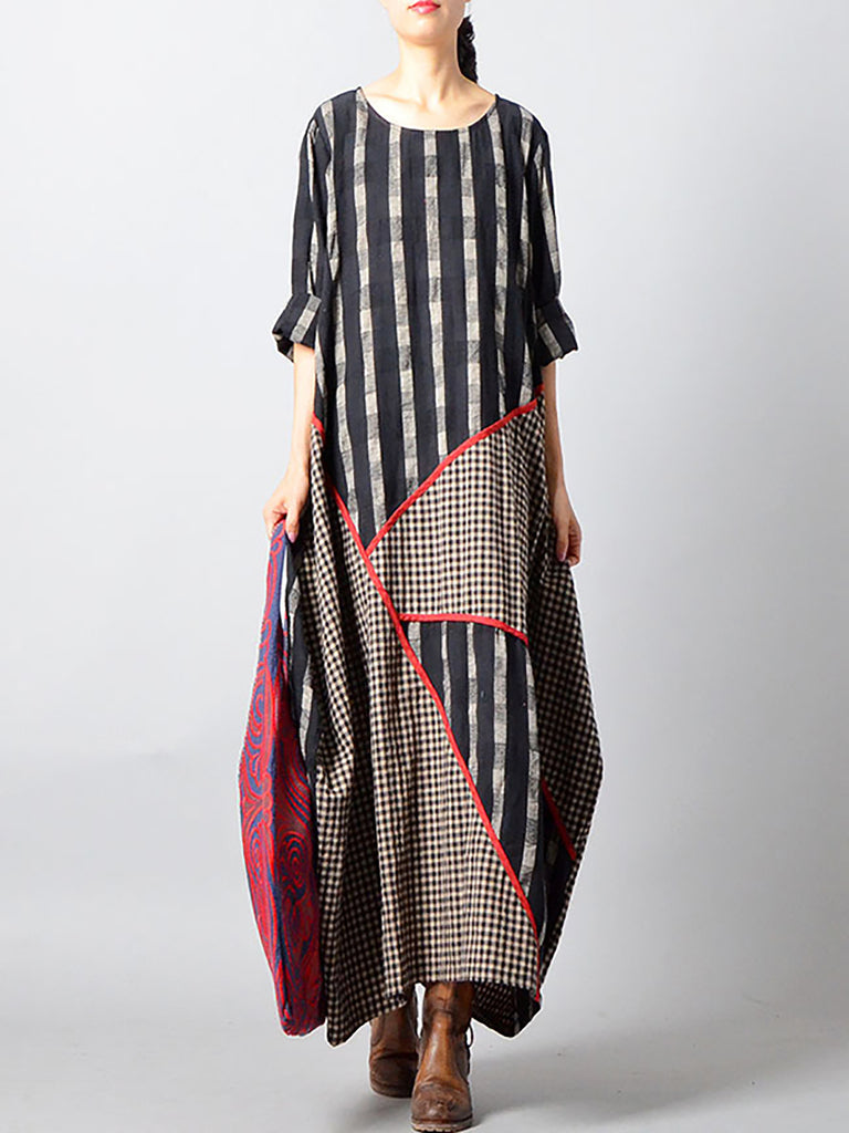Plus Size Algodão Costura Patchwork Bolso Vestido Maxi Manga Longa