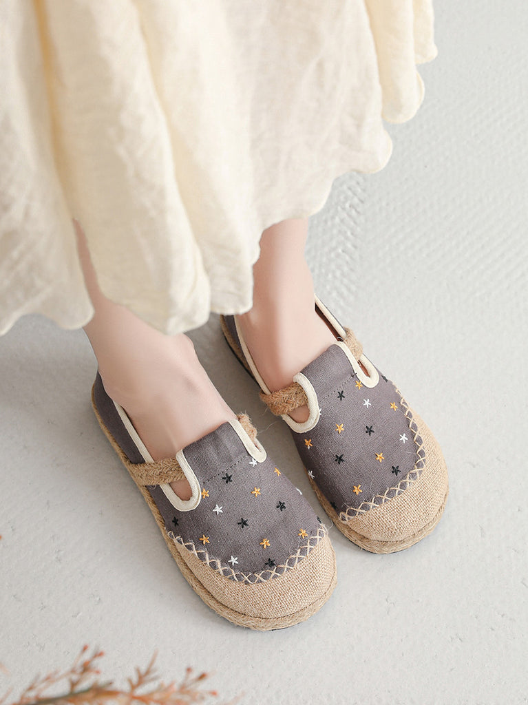 Sapatos femininos étnicos bordados com flores de linho e algodão