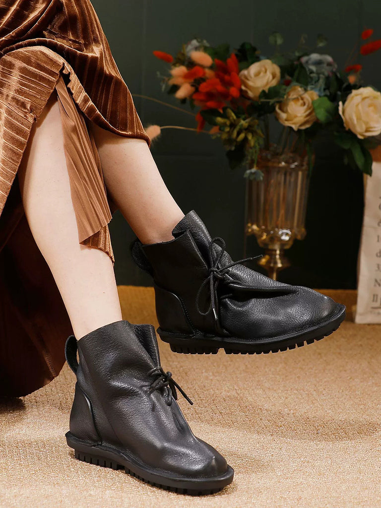 Sapatos baixos femininos vintage de couro legítimo de cor pura