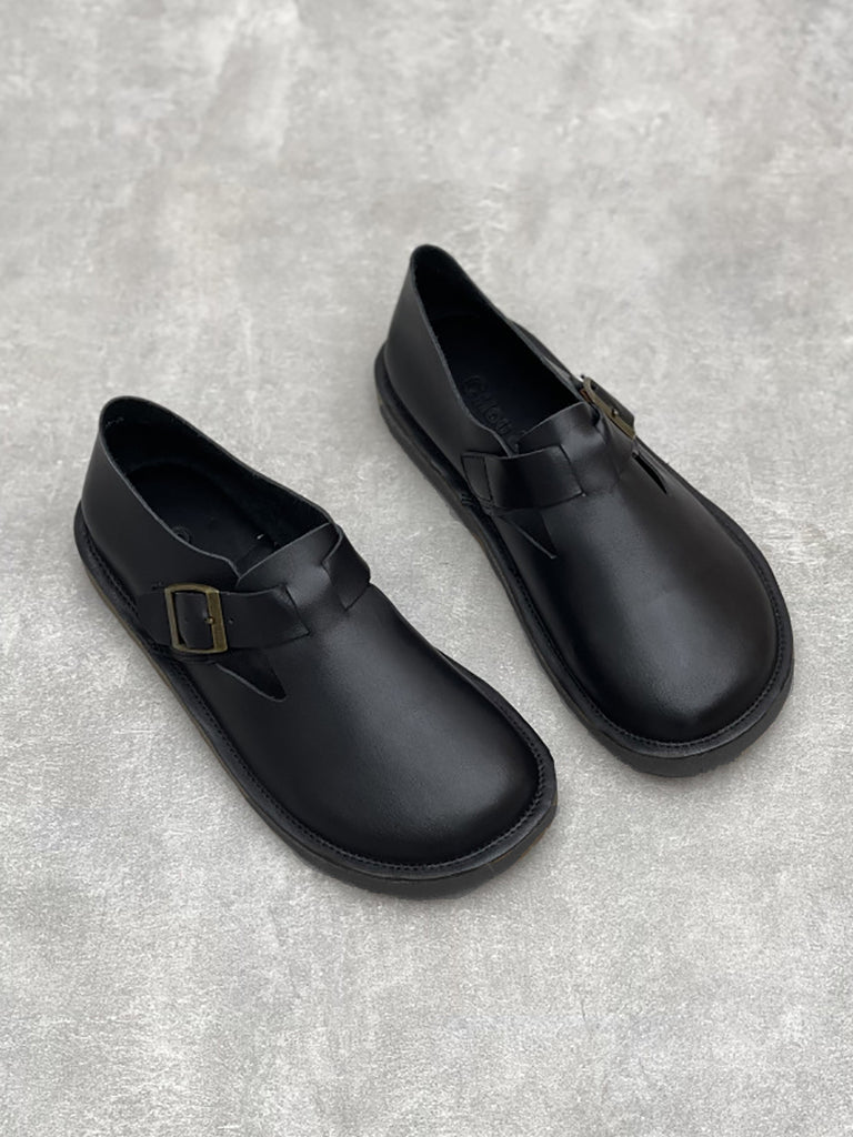 Sapatos baixos vintage de couro legítimo com tiras para mulheres
