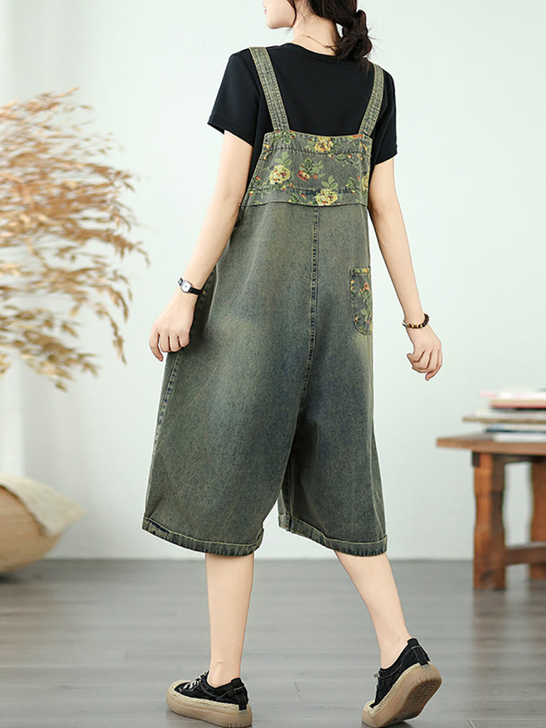 Macacão feminino vintage com estampa floral em algodão e jeans.