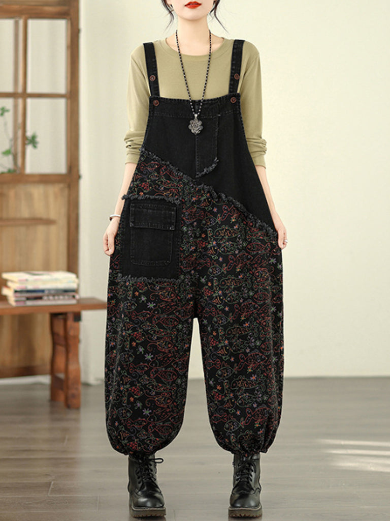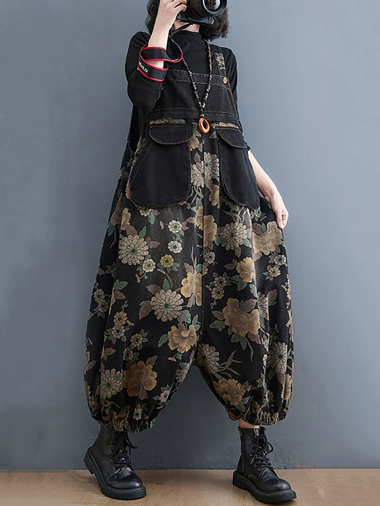 Macacão feminino estilo harem jeans com estampa floral retrô de outono