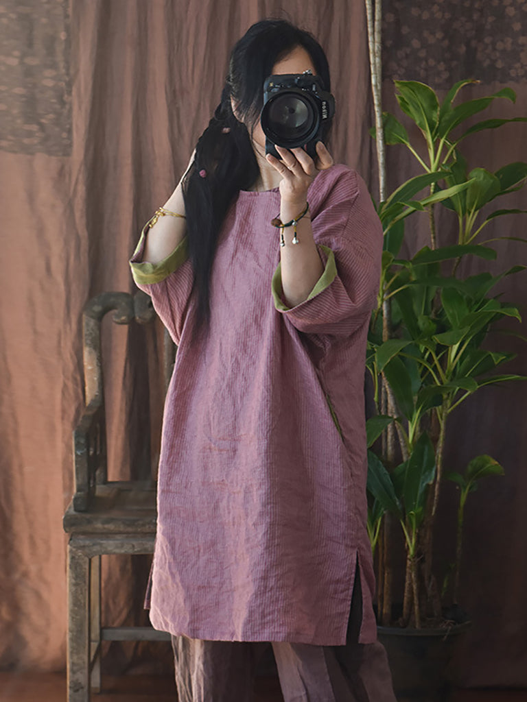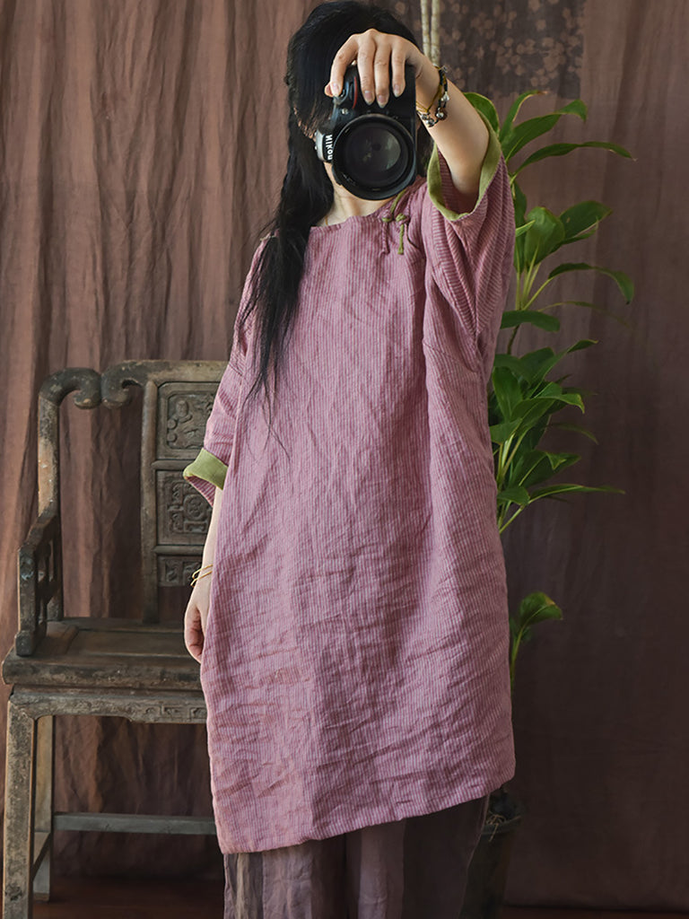 Vestido feminino primavera vintage emendado solto com decote em O