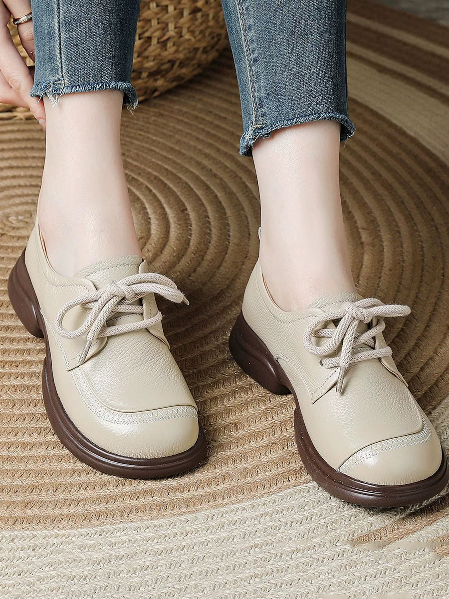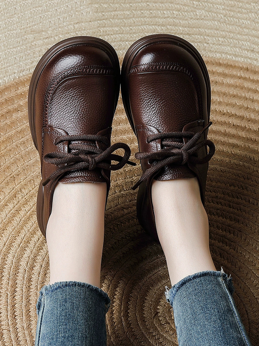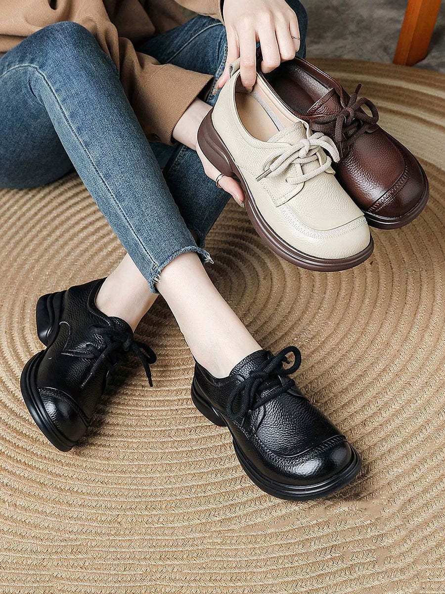 Sapatos femininos de salto baixo em couro legítimo estilo retrô para a primavera