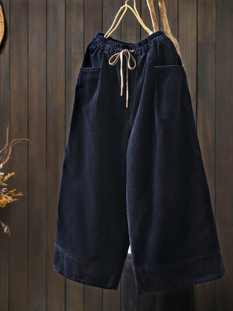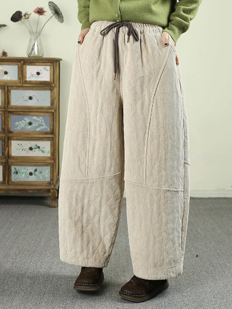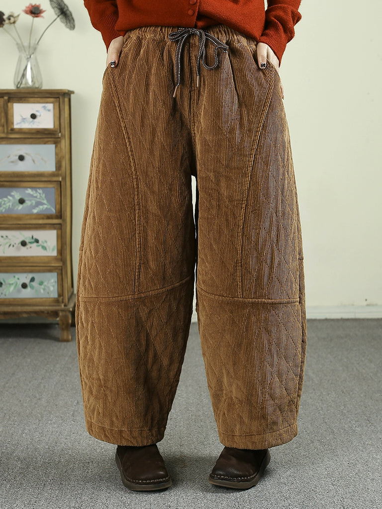 Calça feminina de inverno retrô em veludo cotelê com acolchoamento e pernas largas