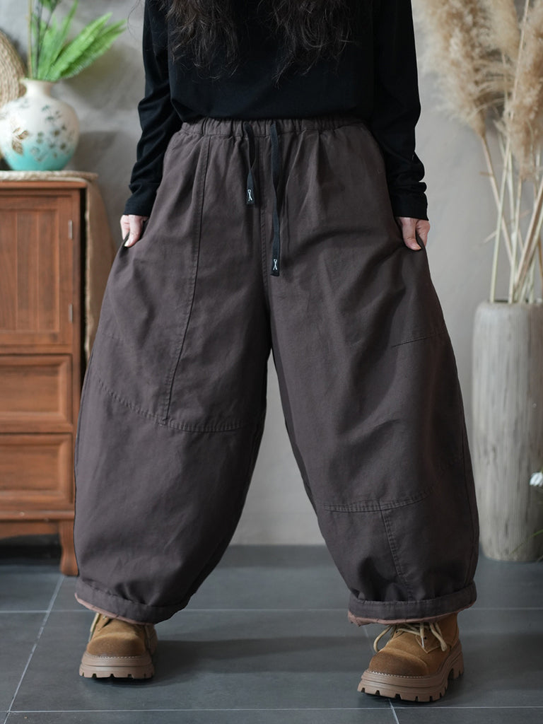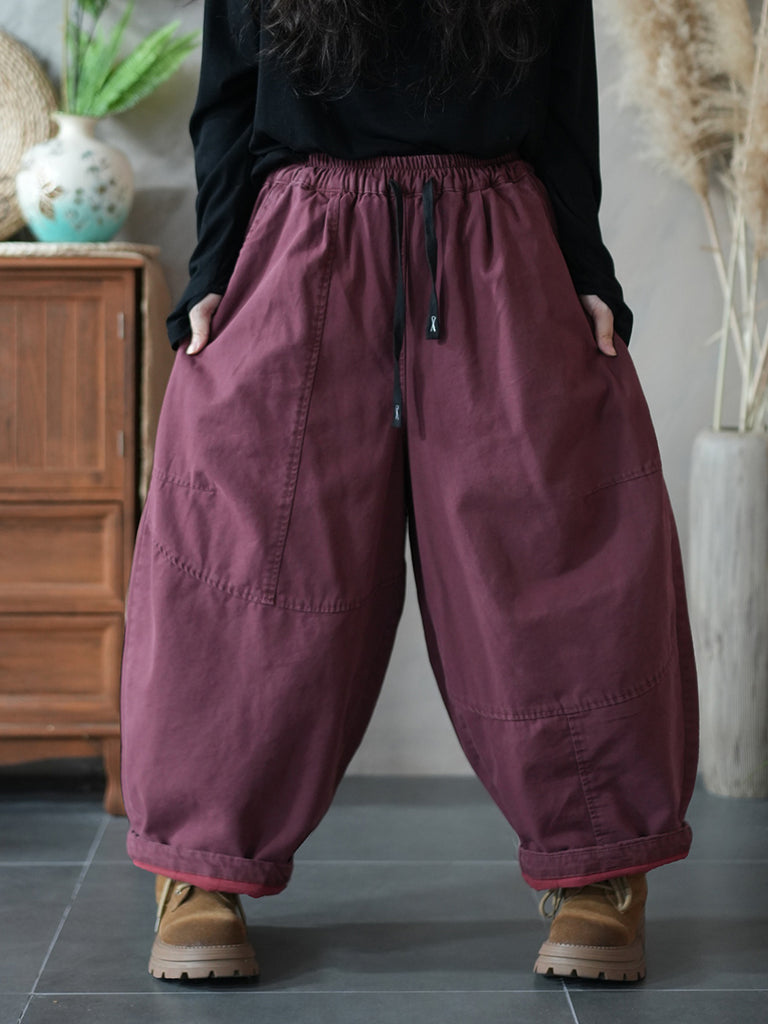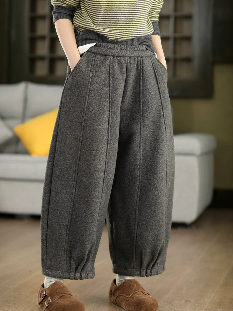 Calça Harem Feminina de Inverno Estilo Retrô, Cor Lisa, Forrada com Lã