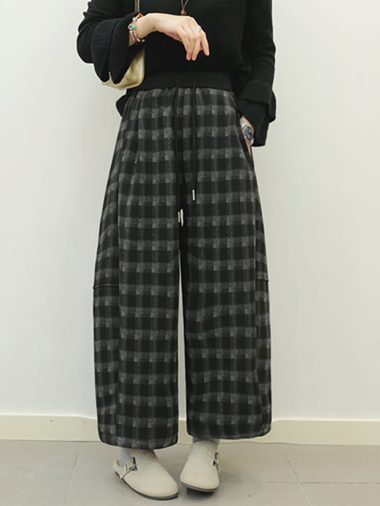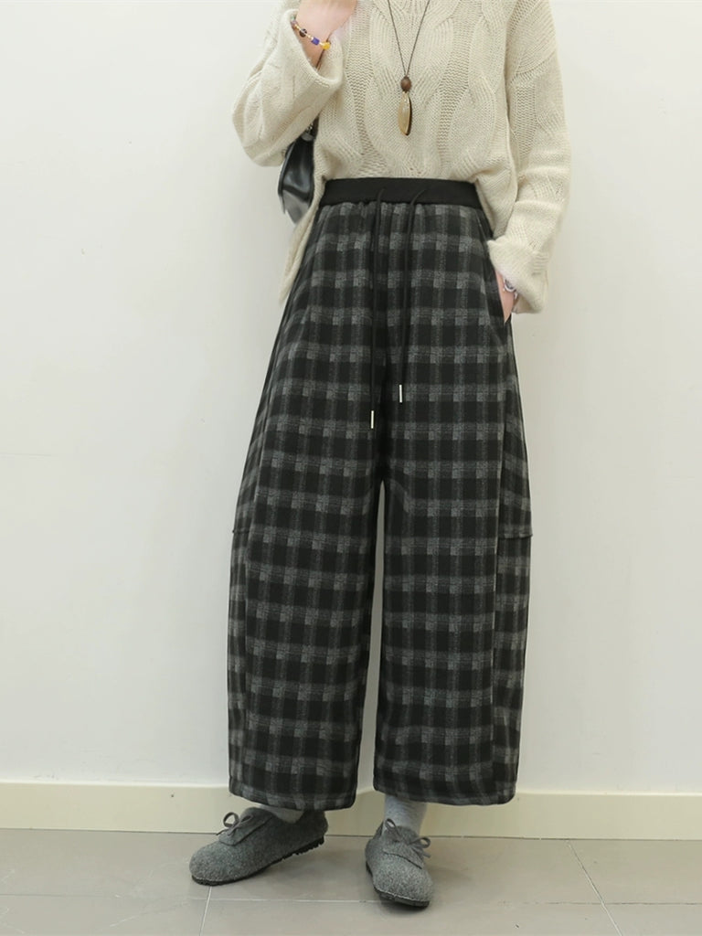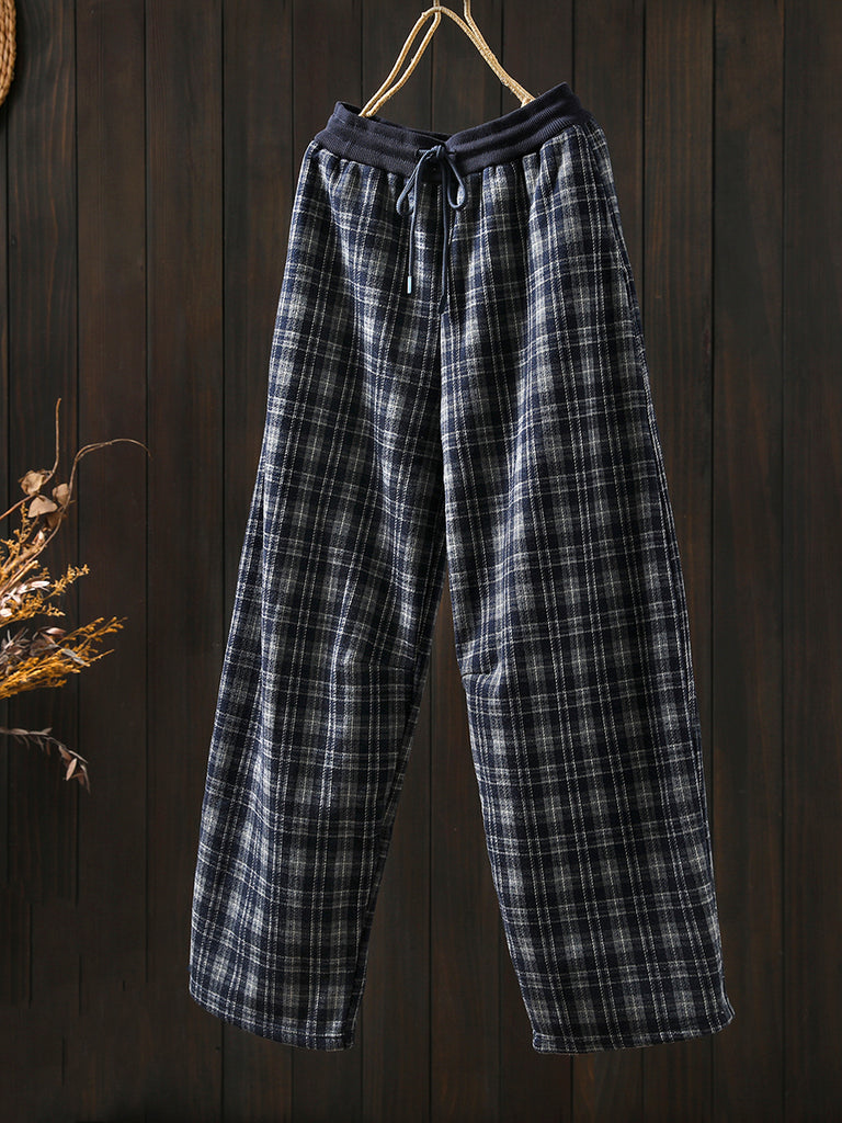 Calça feminina de inverno retrô xadrez com forro de lã e pernas largas