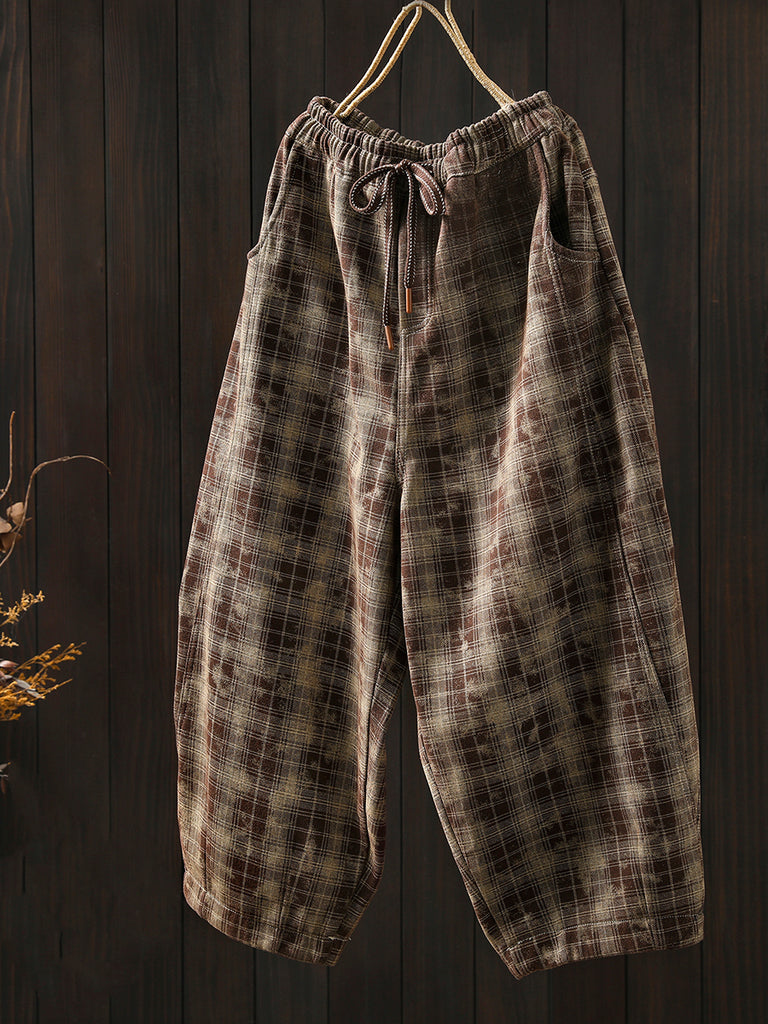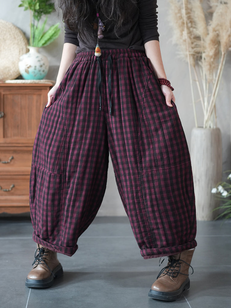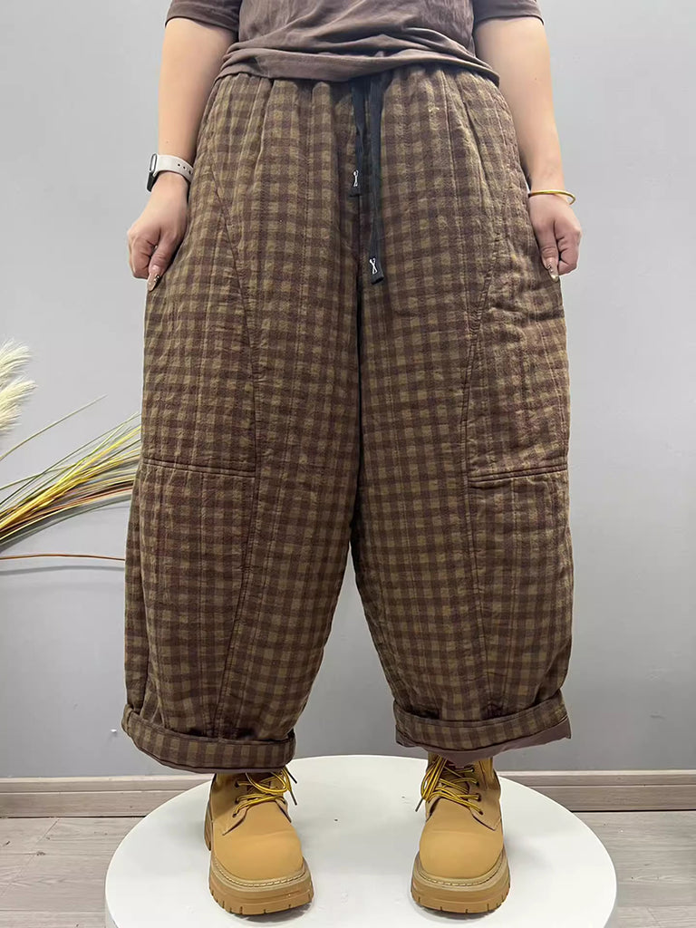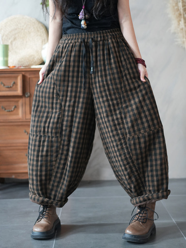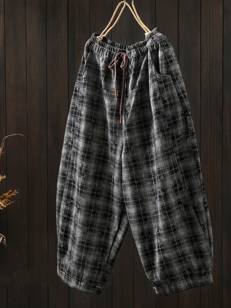 Calça Harem Feminina de Inverno Estilo Retrô Xadrez com Forro de Lã