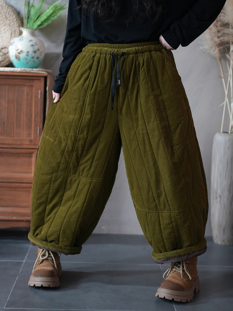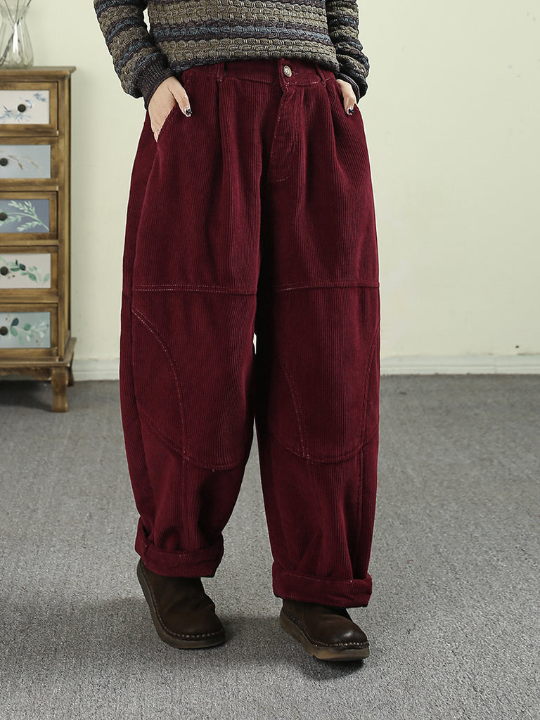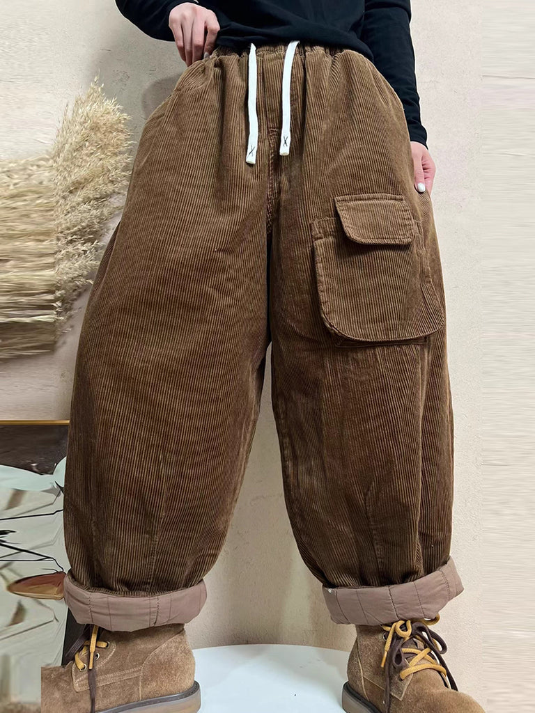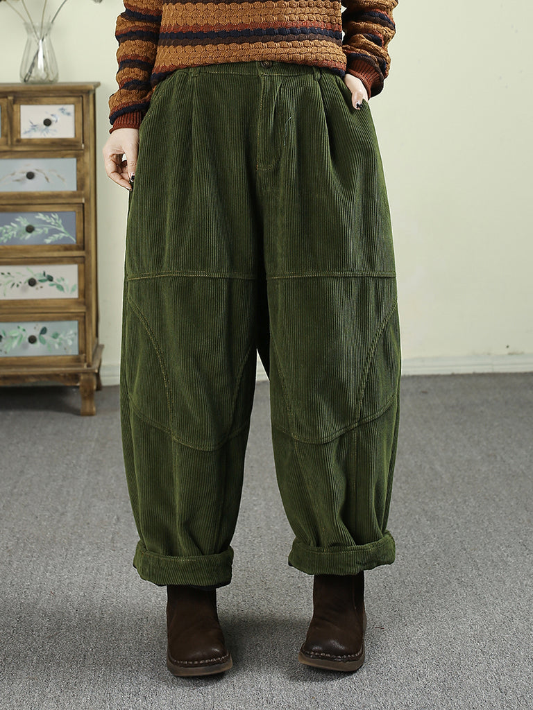Calça Harem Feminina de Inverno Retrô em Veludo Cotelê Cor Sólida com Acolchoamento