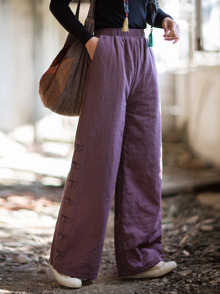 Calça feminina de inverno retrô, lisa, forrada com lã, de pernas largas.