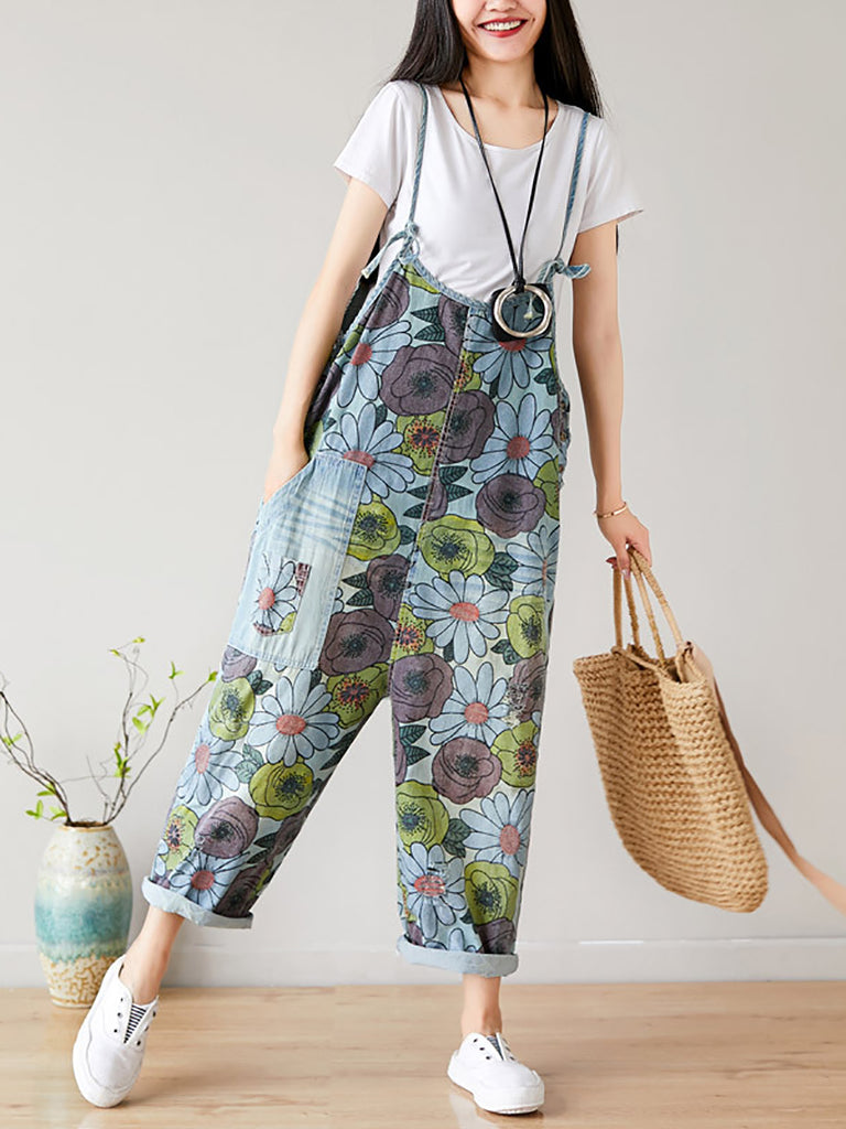 Macacões femininos verão artístico flor estampado bolso solto jeans