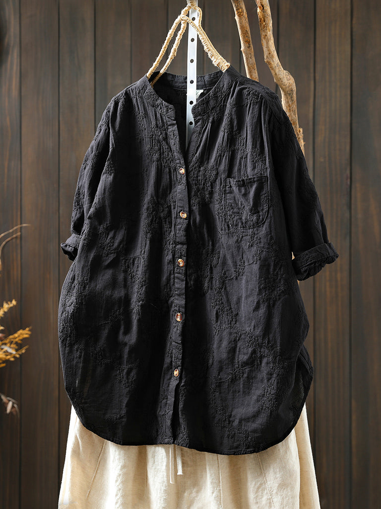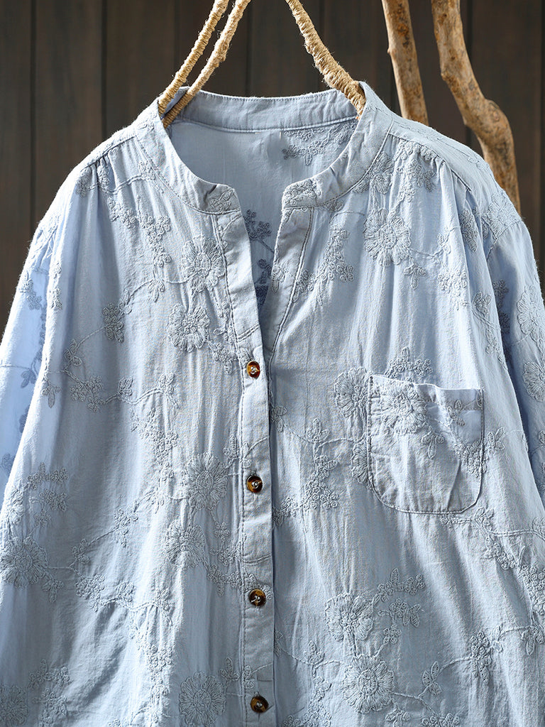 Camisa feminina de verão com bordado de flores artísticas e decote em V 100% algodão