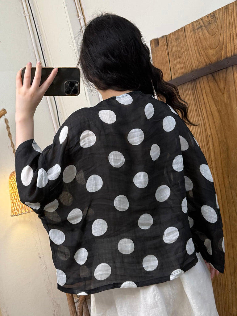 Camisa feminina casual de verão com bolinhas e gola redonda de rami