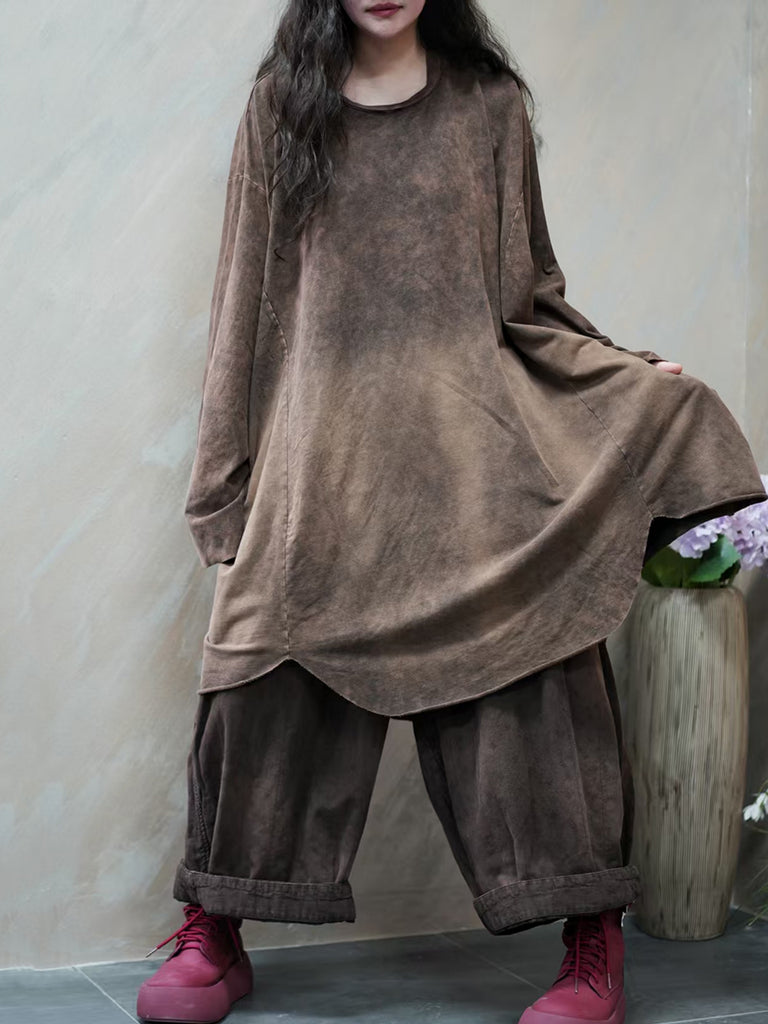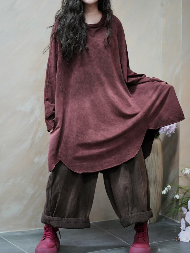 Blusa feminina de algodão com gola redonda, retrô, de cor pura, outono