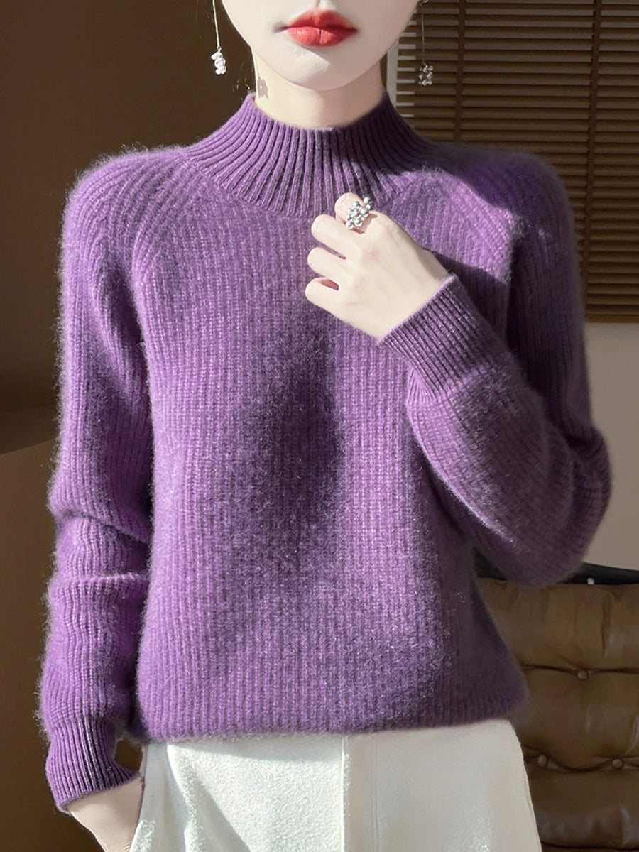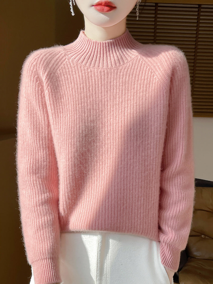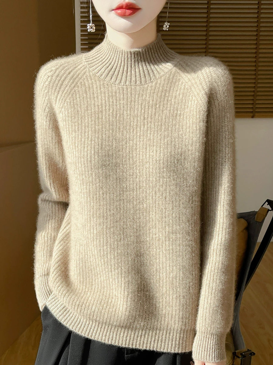 Suéter feminino de gola alta curta em lã, cor lisa, estilo artístico para o outono.