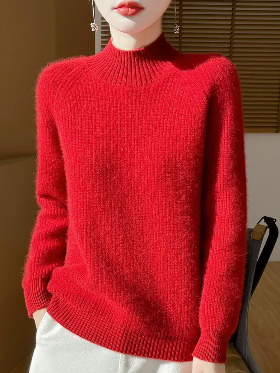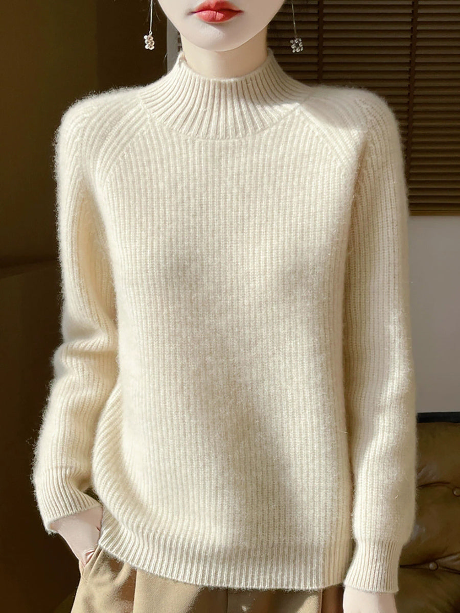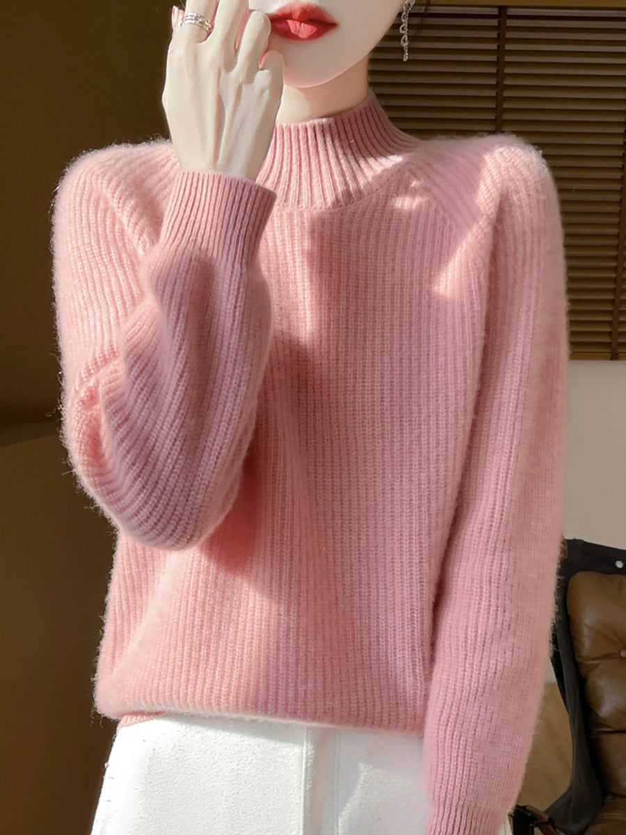 Suéter feminino de gola alta curta em lã, cor lisa, estilo artístico para o outono.
