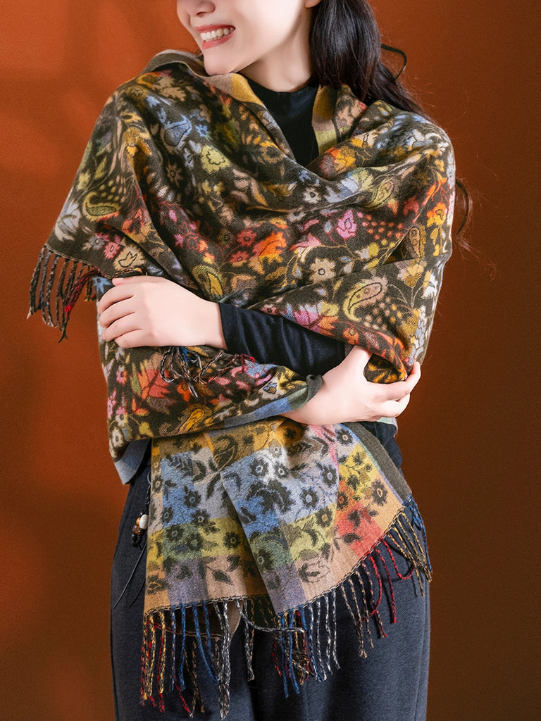 Cachecol xale com borla e bloco de cores vintage de flores para inverno feminino