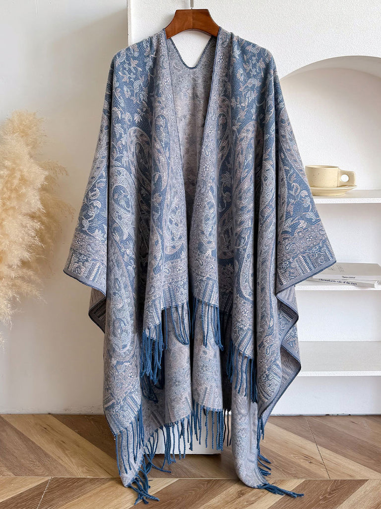 Xale feminino de inverno com estampa floral jacquard e franjas