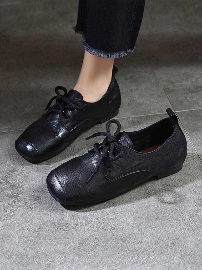 Sapatos femininos vintage de couro legítimo com bico quadrado e salto baixo