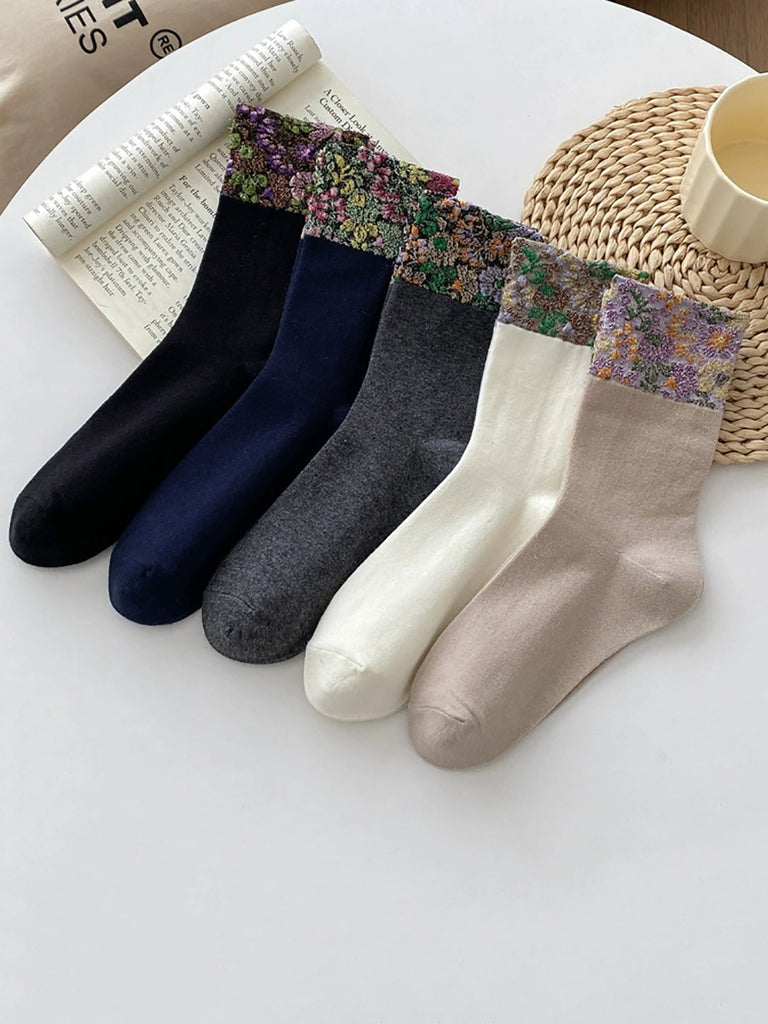 5 pares de meias de algodão femininas com estampa de flores de outono