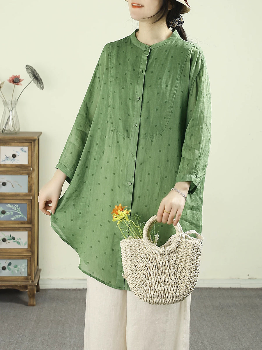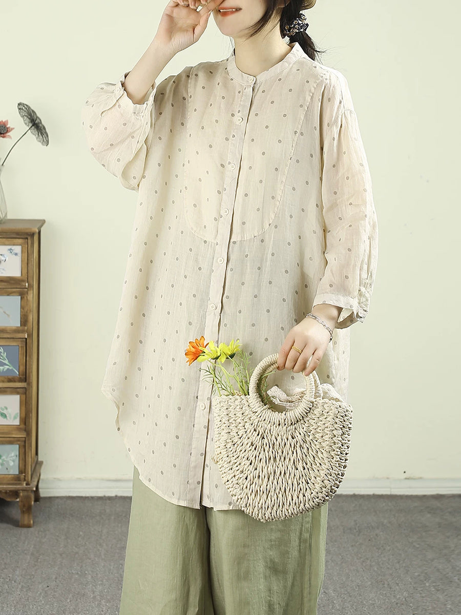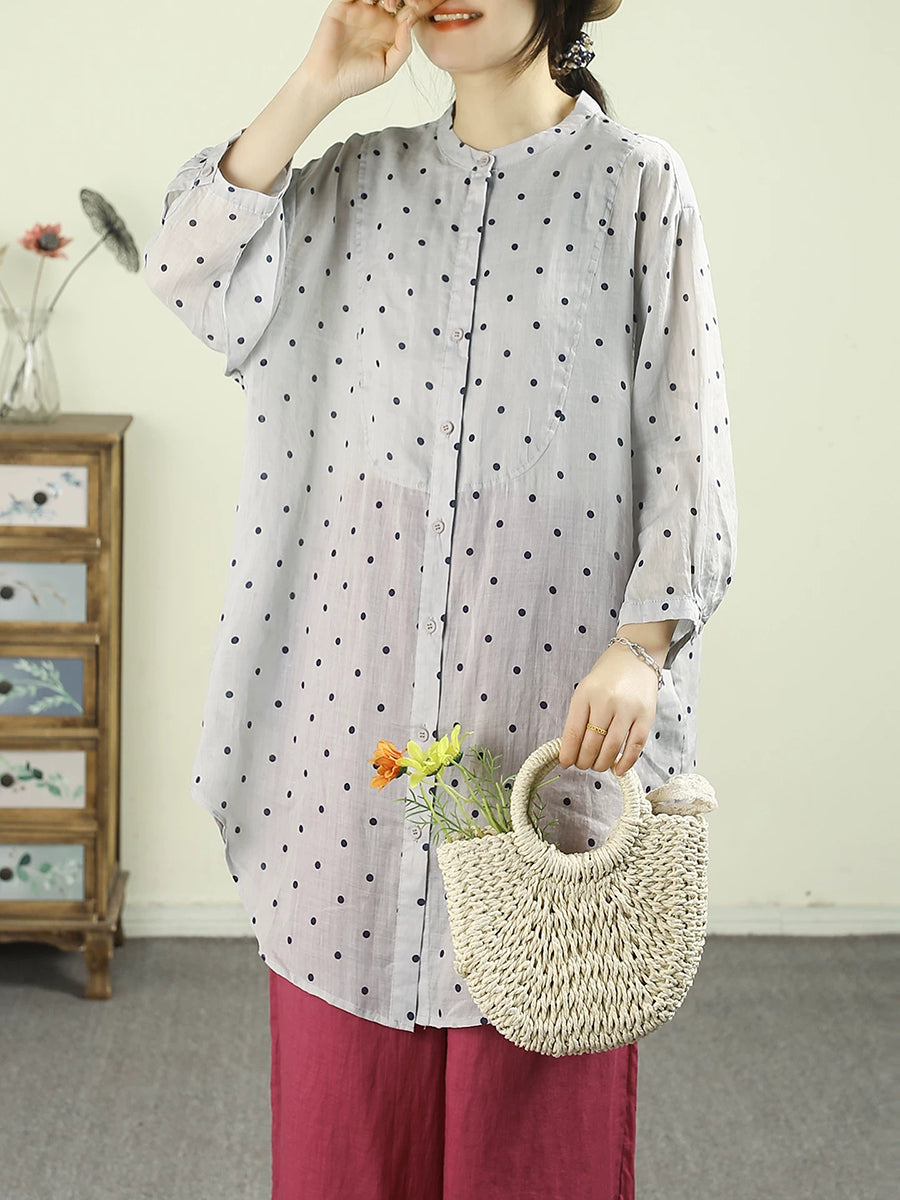 Blusa feminina Artsy Spring com estampa de bolinhas e gola alta, 100% rami.