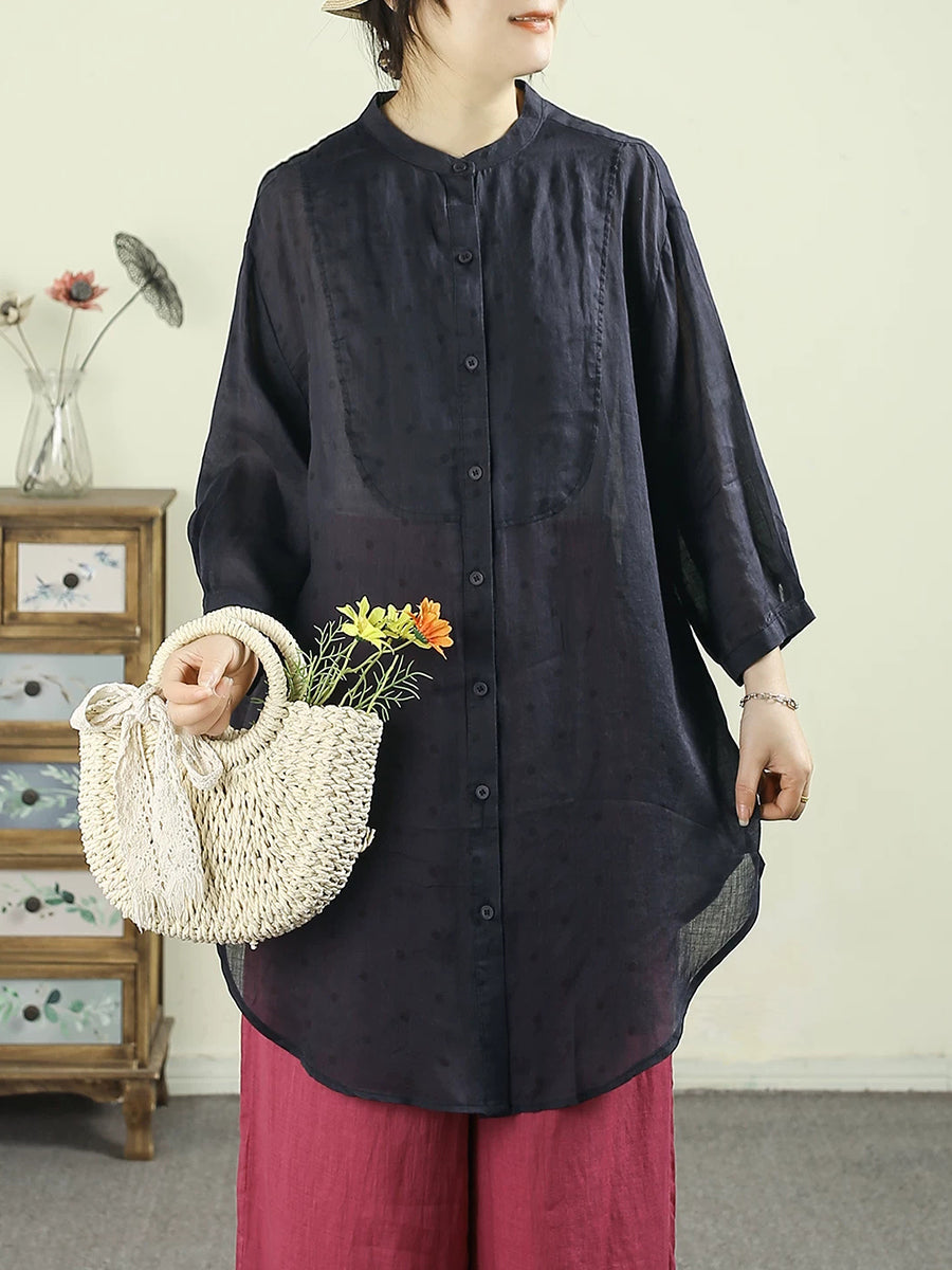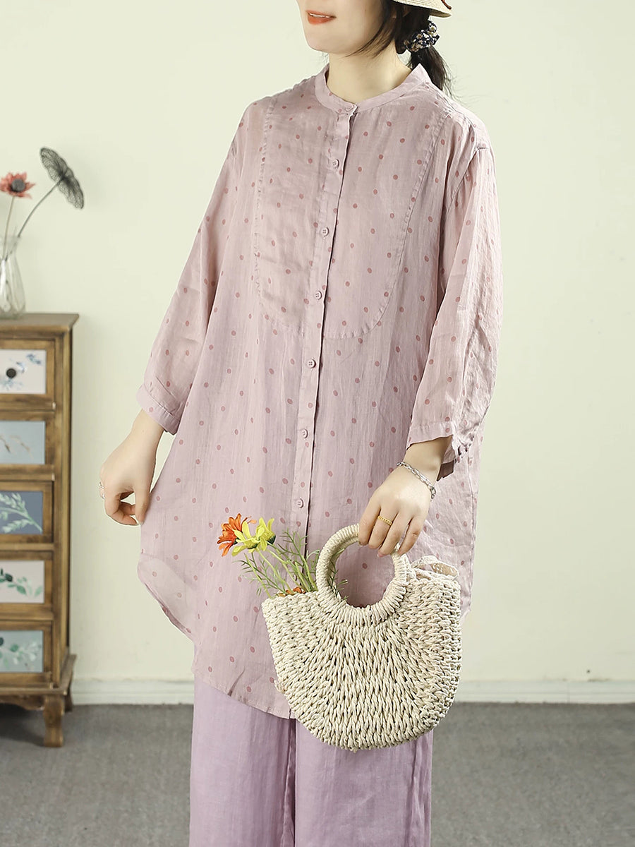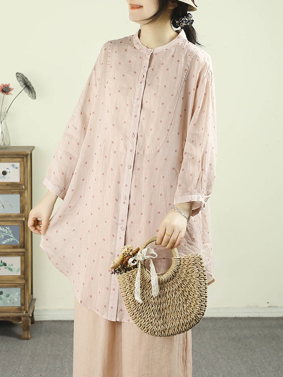 Blusa feminina Artsy Spring com estampa de bolinhas e gola alta, 100% rami.